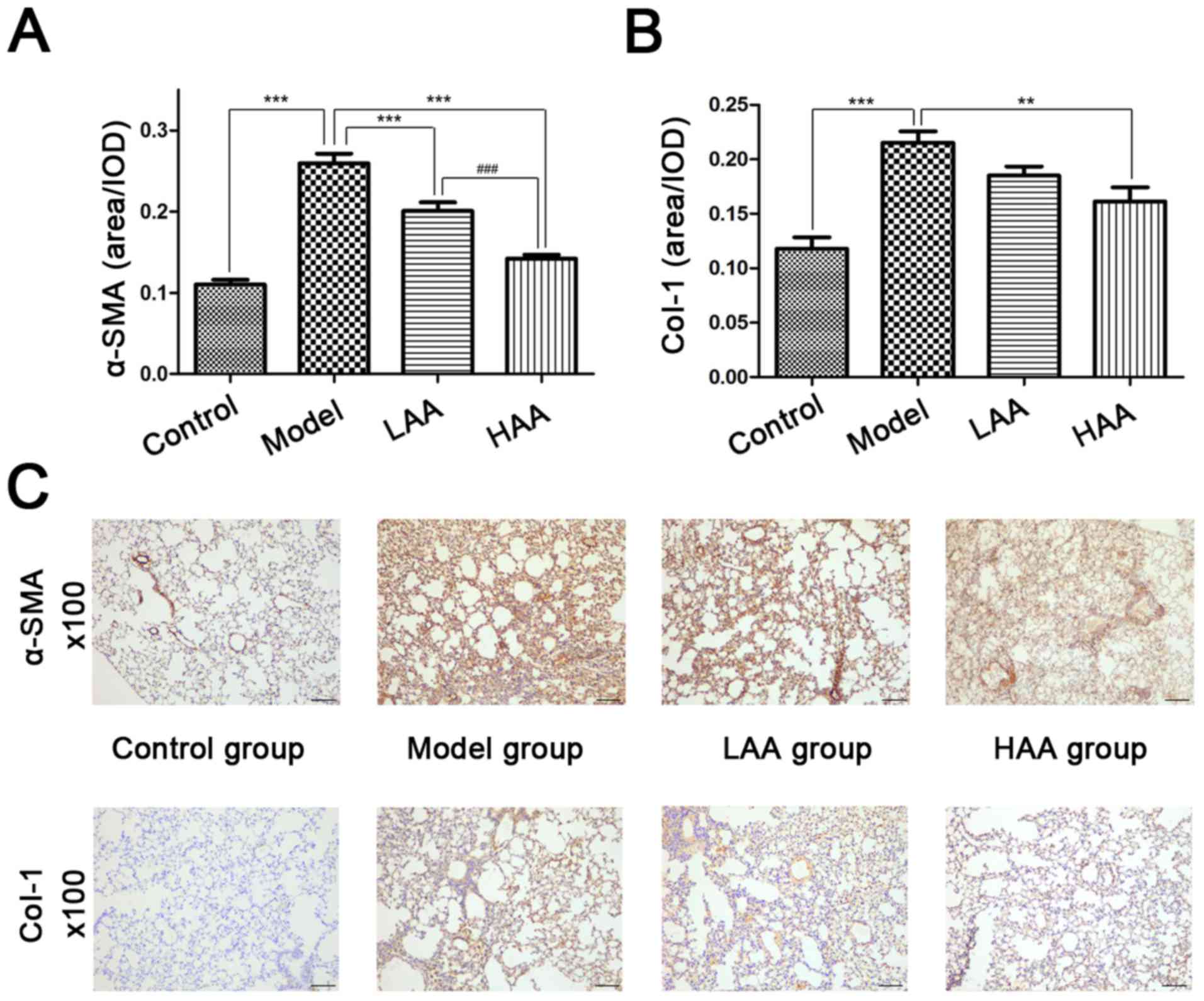 The therapeutic antifibrotic effects of AA on lung pathology was assessed in a HOCl-induced SSc mouse model. Immunohistochemical staining was used to evaluate α-SMA and Col-I expression in lungs prior to and following AA treatment (Fig. 2). The expression of α-SMA and Col-I was significantly reduced in the lungs following AA treatment compared with the model group. Compared with the control group, the expression levels of both proteins were significantly higher in the model group (P<0.05). Compared with the model group, the expression levels of both proteins were significantly lower in the HAA group (P<0.05). Notably, α-SMA expression in the HAA group was significantly lower compared with that of the LAA group (P<0.05). No significant difference was identified in Col-I expression between the LAA and HAA groups, but a decreasing trend was observed.