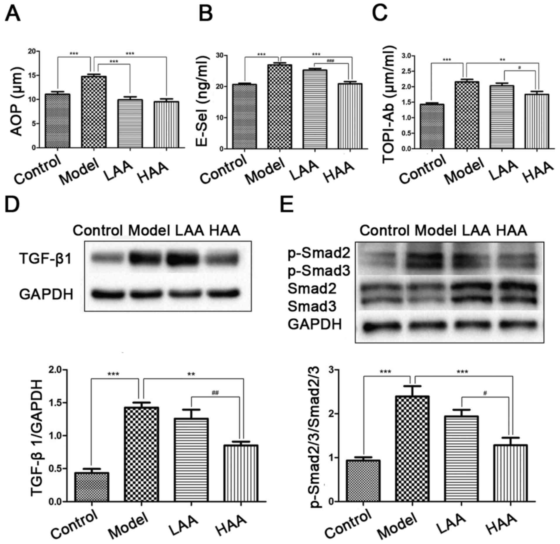 Sodium hypochlorite (NaClO), potassium dihydrogen phosphate (KH2PO4) solution, sodium carboxymethylcellulose (CMC-Na) and AA were obtained from Sigma-Aldrich; Merck KGaA (Darmstadt, Germany). AA was dissolved in dimethyl sulfoxide, and then diluted with a 0.5% CMC-Na solution to create separate solutions with concentrations of 0.1 and 0.4 mg/ml. Advanced oxidation protein products (AOPP; 10572-09m), E-selectin (E-sel; 10316-09m) and anti-DNA topoisomerase I autoantibody (TOP1-Ab; 10821-09m) enzyme-linked immunosorbent assay (ELISA) kits were obtained from Shanghai Boyun Biochemical Institute (Shanghai, China; http://www.chem-china.net/). Rabbit antibodies against type I collagen (Col-I; ab21286) and α-SMA (ab5694), and mouse antibodies against TGF-β1 (ab64715) were purchased from Abcam (Cambridge, UK). Rabbit antibodies against GAPDH (cat. no. 8884), Smad2/3 (cat. no. 8685), and phosphorylated (p)-Smad2/3 (cat. no. 8828) were purchased from Cell Signaling Technology Inc., (Danvers, MA, USA). Goat anti-rabbit (BA1054) and goat anti-mouse horseradish peroxidase (HRP)-conjugated IgG (BA1050) were purchased from Wuhan Boster Biological Technology, Ltd. (Wuhan, China). A DAB kit and mouse/rabbit plus Polymer HRP Detection system (PV-6000) were provided by OriGene Technologies, Inc. (Beijing, China). SuperSignal West Femto Maximum Sensitivity substrate and a BCA Protein Assay kit were obtained from Thermo Fisher Scientific, Inc. (Waltham, MA, USA). RIPA lysis buffer was obtained from Beyotime Institute of Biotechonology (Shanghai, China).
