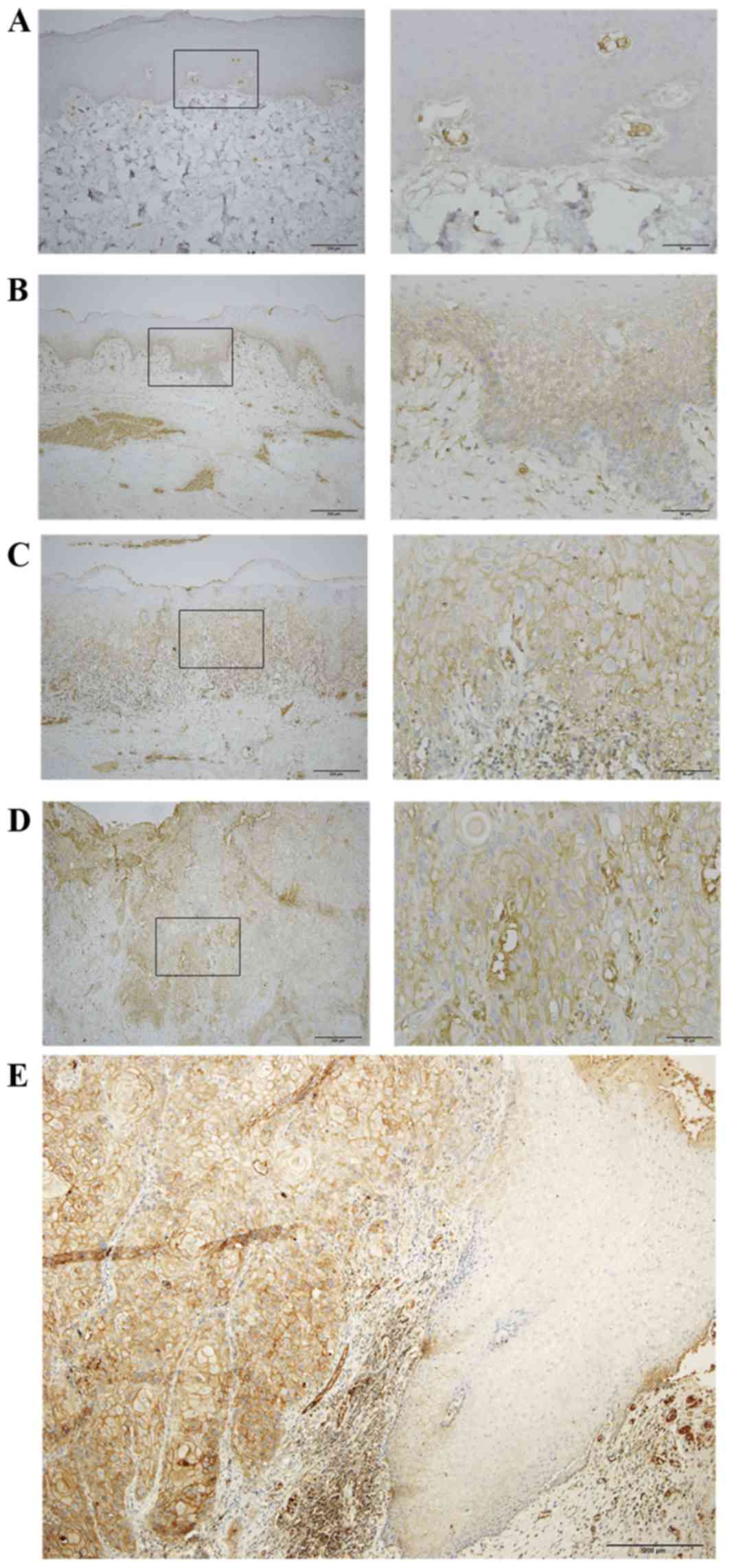 The expression of CD47 was mainly localized on the cell membrane of epithelial cells, with little expression in the cytoplasm. There was very weak positive expression of CD47 in NOM (Fig. 1A). The expression of CD47 in the LR-OLK group was weak, primarily confined to the basal layer of the epithelium (Fig. 1B). In the HR-OLK group, strong staining was observed in the whole spinous layer (Fig. 1C). Almost all cell membrane of epithelial cells were positive for the expression of CD47 in OSCC (Fig. 1D). A prominent feature was that CD47 expression was positively stained in a region that exhibited dysplasia, but there was no expression in epithelium with normal appearance (Fig. 1E).