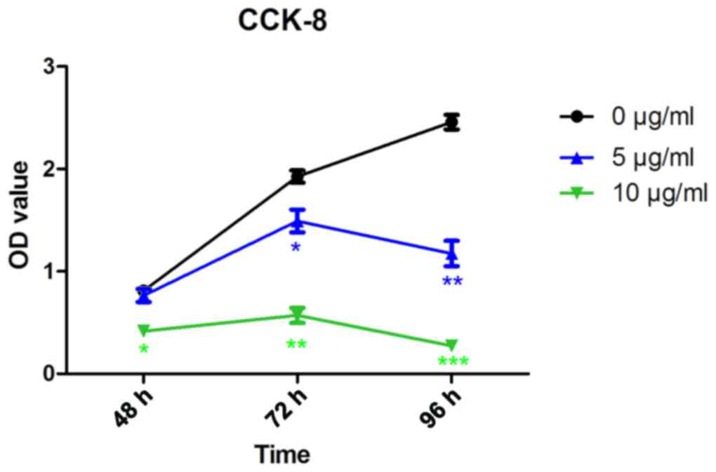 The effect of CD47 antibody on the proliferation of the Cal-27 cell line was utilized by the CCK-8 assay. The proliferation of Cal-27 cells was significantly inhibited by incubation with 5 and 10 µg/ml CD47 antibody compared with the control group (P<0.05; Fig. 4). Following 72 and 96 h stimulation, the proliferation of Cal-27 cells was inhibited by incubation with 5 µg/ml CD47 antibody, but no significant inhibition was observed following 48 h stimulation (Fig. 4). When the concentration of CD47 antibody was increased to 10 µg/ml, significant inhibition appeared following 48, 72 and 96 h stimulation (P<0.05; Fig. 4), which manifested in a concentration- and time-dependent manner.