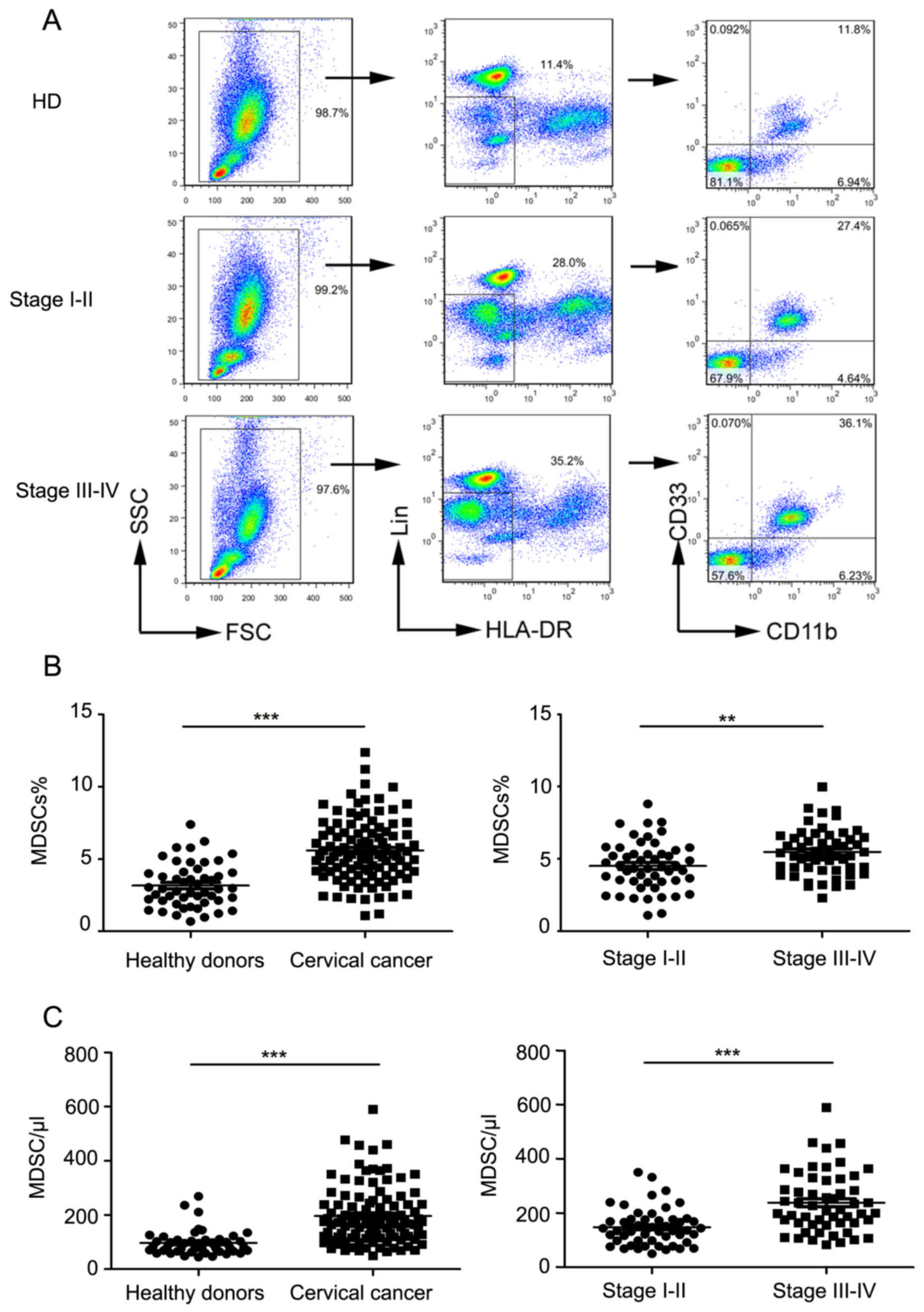 MDSCs play an important role in tumor immune evasion and tolerance. We examined changes in Lin−/lowHLA-DR−CD11b+CD33+ MDSCs in cervical cancer patients based on clinical stage and obtained results that were consistent with other tumor types.