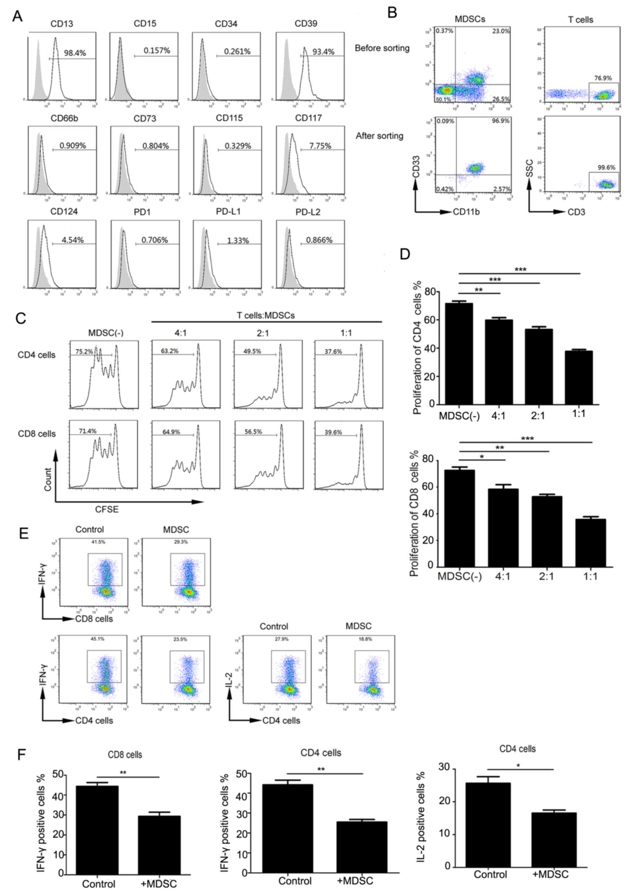 Previous studies showed that Lin−/lowHLA-DR−CD11b+CD33+ MDSCs can inhibit T-cell proliferation in other tumor types. We extracted highly pure (> 95%) MDSCs and CD3+ T-cells (Fig. 3B) from peripheral blood. CFSE-labeled CD3+ T cells were co-cultured with MDSCs at different ratios and stimulated with CD3 and CD28 antibodies. Upon analyzing CFSE fluorescence in CD4 and CD8 T cell subsets, we found that with an increasing proportion of MDSCs, CD4 and CD8 T cells were significantly inhibited (Fig. 3C and D).