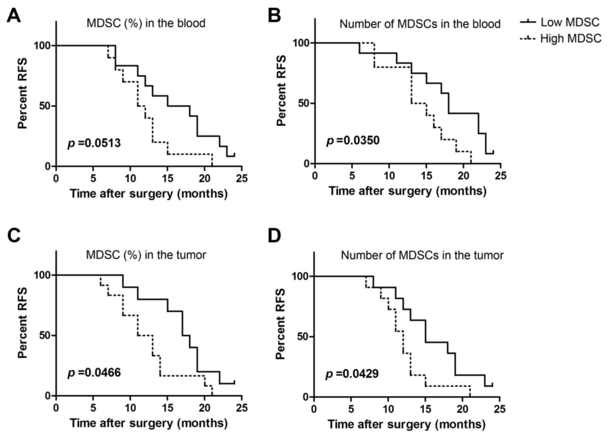 In these other studies, changes in MDSCs were shown to correlate linearly with tumor burden (19,28,29). With increasing clinical stage, circulating MDSCs increase. Late stage cancer patients with higher levels of MDSCs are more prone to recurrence, which in turn affects prognosis (13). Similarly, we showed that peripheral circulating and tumor-infiltrating MDSC levels are associated with RFS. Possible reasons for these are as follows: Circulating tumor cells or tumor cells in the tumor microenvironment could secrete cytokines resulting in the expansion of MDSCs and produce pro-inflammatory and angiogenic cytokines to recruit MDSCs, promoting tumor proliferation and invasion (30).
