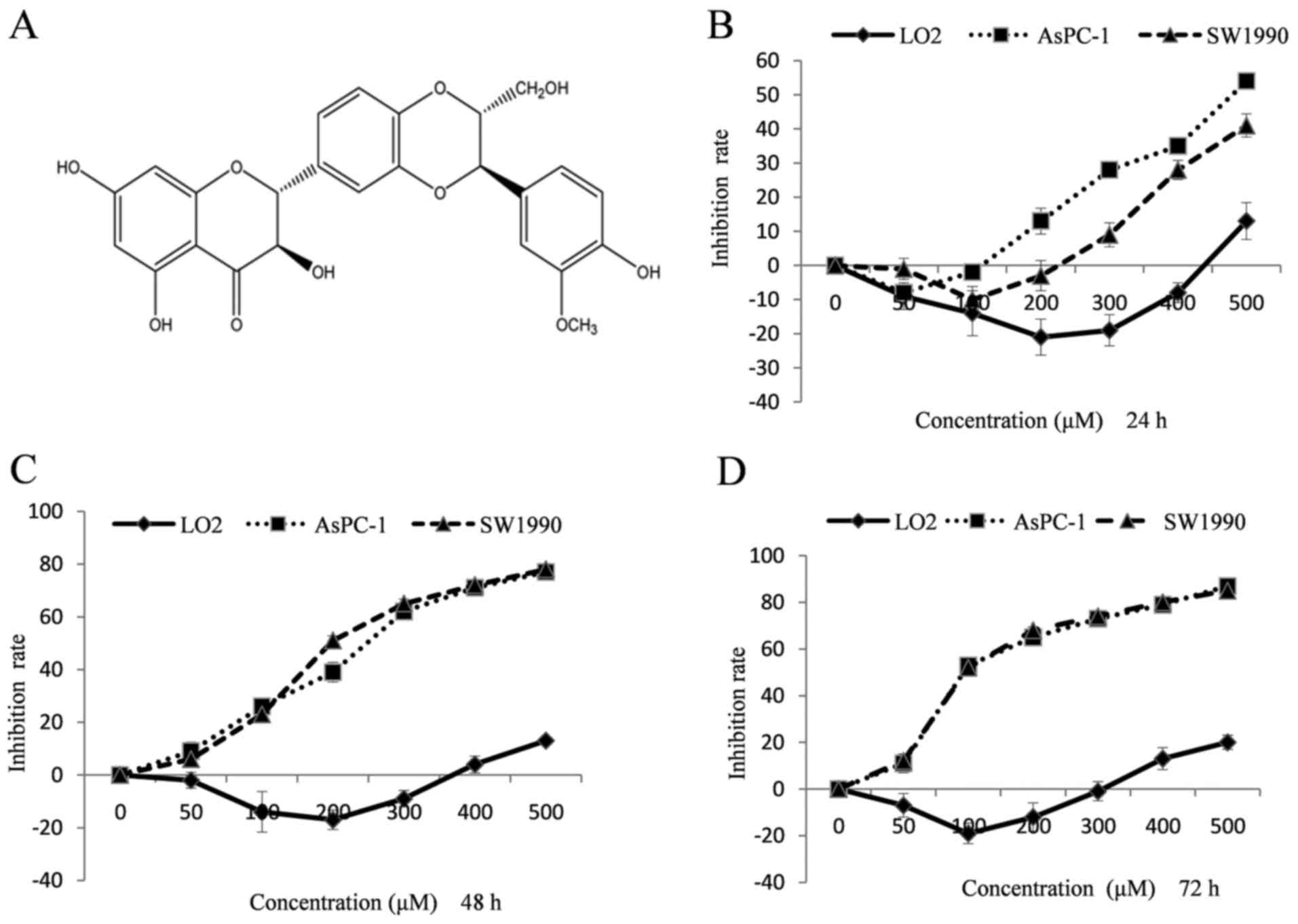 The LO2 human hepatic cell line and the AsPC-1 and SW1990 human pancreatic cancer cell lines were obtained from the Department of Biochemistry, Medical College of Jinan University (Guangzhou, China). All cells were maintained in RPMI-1640 supplemented with 5% fetal bovine serum at 37°C in 95% humidified air containing 5% CO2. Silibinin (Fig. 1A) was purchased from Sichuan Weikeqi Biological Technology Co., Ltd. (Chengdu, China).