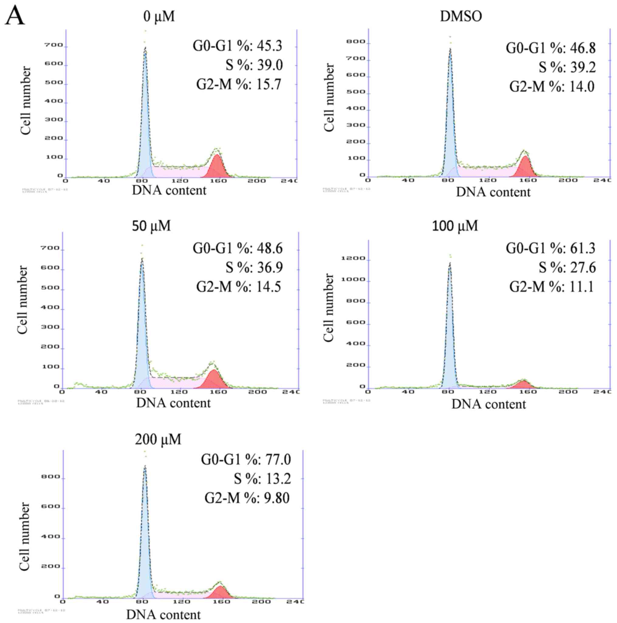 Fetal bovine serum, RPMI-1640, trypsin and EDTA were purchased from Gibco (Thermo Fisher Scientific, Inc., Waltham, MA, USA). MTT, dimethyl sulfoxide (DMSO), Annexin V-fluorescein isothiocyanate (FITC) and propidium iodide (PI) were purchased from Sigma-Aldrich (Merck KGaA, Darmstadt, Germany). The antibody against cleaved caspase-3 was purchased from Epitomics (Burlingame, CA, USA). Antibodies against cyclin D1 (cat. no. 2978; dilution 1:1,000), cyclin E2 (cat. no. 4132; dilution 1:1,000), cyclin A (cat. no. 4656; dilution 1:1,000), cyclin B2 (cat. no. 4135; dilution 1:1,000), cyclin-dependent kinase (CDK)4 (cat. no. 12790; dilution 1:1,000), CDK6 (cat. no. 13331; dilution 1:1,000), p15 (cat. no. 8762; dilution 1:1,000), p21 (cat. no. 2947; dilution 1:1,000), B-cell lymphoma 2 associated protein X (Bax; cat. no. 5023; dilution 1:1,000), B-cell lymphoma 2 (Bcl-2; cat. no. 15071; dilution 1:1,000), Bcl-2-like 1 (Bcl-xl; cat. no. 2764; dilution 1:1,000), myeloid cell leukemia 1(Mcl-1; cat. no. 94296; dilution 1:1,000), Bcl-2-like 1 small (Bcl-xs; cat. no. 2764; dilution 1:1,000), Bcl-2-like 11 (Bim; cat. no. 2933; dilution 1:1,000), Jun N-terminal kinase (JNK; cat. no. 9252; dilution 1:1,000), phosphorylated JNK (p-JNK; cat. no. 4668; dilution 1:1,000), caspase-9 (cat. no. 9508; dilution 1:1,000), caspase-3 (cat. no. 9665; dilution 1:1,000), poly (ADP-ribose) polymerase (PARP; cat. no. 9532; dilution 1:1,000), GAPDH (cat. no. 5174; dilution 1:1,000) and horseradish peroxidase-conjugated goat anti-rabbit immunoglobulin G secondary antibody (cat. no. 7054; dilution, 1:5,000), and horseradish peroxidase-conjugated goat anti-mouse immunoglobulin G secondary antibody (cat. no. 7056; dilution, 1:5,000) were purchased from Cell Signaling Technology, Inc. (Danvers, MA, USA).