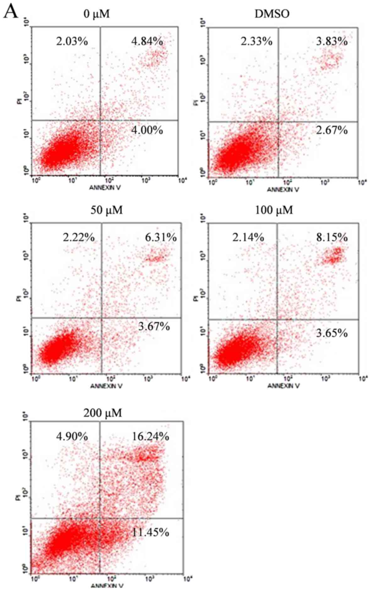 SW1990 cells in logarithmic growth phase were seeded at a density of 3×105 per well into 6-well tissue culture plates. Subsequently, cells were treated with various concentrations of silibinin (50, 100 and 200 µM), and DMSO (<0.1%) was used as the vehicle control. Following 48 h of incubation at 37°C, the cells were harvested using trypsin. The cells were washed twice with ice-cold PBS, re-suspended in 200 µl of binding buffer (HEPES, NaCl and CaCl2) and incubated with 10 µl Annexin V-FITC and 5 µl of PI for 15 min at room temperature in the dark. A flow cytometer was used to analyze the percentage of early and late apoptotic cells. A total of 10,000 cells were analyzed by WinMDI version 2.9 software (The Scripps Research Institute, San Diego, CA, USA).