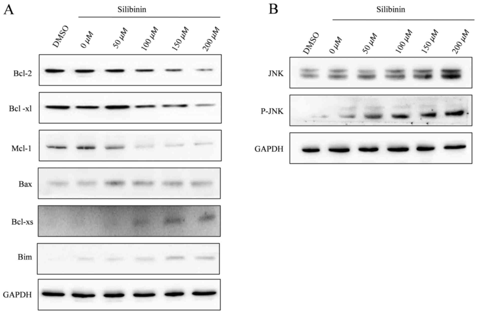 The mitochondrial-mediated apoptotic signaling pathway is associated with the expression and activation of the Bcl-2 protein family. Bcl-2 proteins are grouped into three classes: Those that inhibit apoptosis (Bcl-2, Bcl-xl, Bcl-2-like 2, Mcl-1, Bcl-10, Boo/Diva, NR-13 and Bcl-2-related protein A1); those that promote apoptosis (Bak, Bax, Bcl-xs, Bcl2-related ovarian killer); and the pro-apoptotic BH3-only proteins (Bad, Bid, Bcl2-interacting killer, Bim, B lymphocyte kinase, Bcl2-modifiying factor (Bmf), harakiki Bcl2-interacting factor, Bcl2-interacting protein 23, NIP3-like protein X and Noxa) that bind and regulate the anti-apoptotic Bcl-2 proteins (40,41). In the present study, western blotting analysis demonstrated that with increasing concentrations of silibinin, the expression of the anti-apoptotic Bcl-2 family of proteins Bcl-2, Bcl-xl and Mcl-1 was decreased, whereas the expression of the BH3-only protein Bim was increased in a concentration-dependent manner. The expression of the pro-apoptotic protein Bcl-xs was increased, whereas the expression of another pro-apoptotic protein Bax was unaltered. These results suggest that Bim may form a heterodimer with Bcl-2 or Mcl-1 and promote dissociation of Bax/Bcl-2 or Bax/Mcl-1 heterodimers. This event promotes Bax oligomerization and cytochrome-c release from the mitochondria, which initiates the mitochondrial-mediated apoptotic signaling pathway. The expression of the pro-apoptotic protein Bcl-xs was increased, and therefore Bcl-xs may be able to activate Bak or Bax through inhibiting the function of voltage-dependent anion channel 2 and Bcl-xl (42). Although the protein levels of anti-apoptotic proteins, including Bcl-2, Mcl-1 and Bcl-xl, were decreased, the ratios of Bax/Bcl-2, Bax/Mcl-1 and Bax/Bcl-xl were increased, resulting in an increased quantity of unbound Bax and initiation of the mitochondrial-mediated apoptotic signaling pathway.