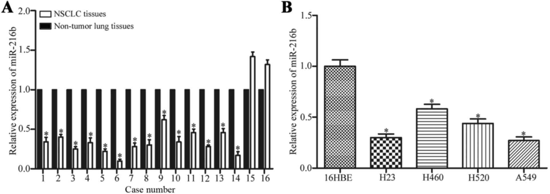 To understand the association between miR-216b and NSCLC, miR-216b expression levels in NSCLC tissues and the adjacent non-tumor lung tissues were measured by qPCR. The results demonstrate that 14/16 of NSCLC tissues exhibited lower miR-216b expression compared with adjacent non-tumor lung tissues, as illustrated in Fig. 1A. The miR-216b expression levels were also measured in four human NSCLC cell lines including H23, H460, H520 and A549. The results revealed that miR-216 was downregulated in all four human NSCLC cell lines compared with those in normal bronchial epithelial 16HBE cell line (Fig. 1B). These results indicate that miR-216b may serve an important role in NSCLC.