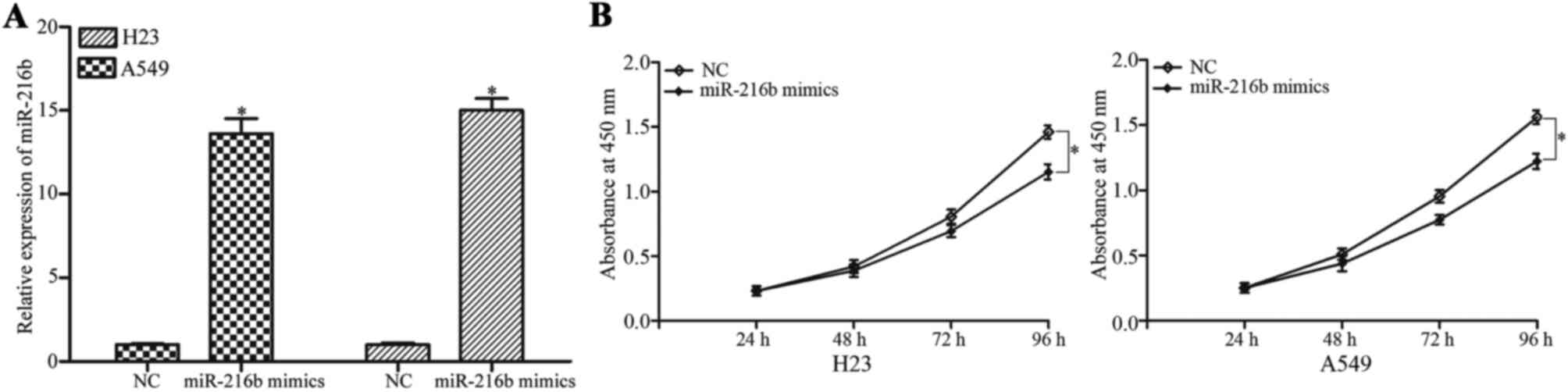 To investigate the role of miR-216b in NSCLC cells, the effect of miR-216b on NSCLC cell proliferation was examined. miR-216b mimics or NC were introduced into the H23 and A549 cells, which exhibit a low expression of miR-216b. Subsequent to transfection, miR-216b was significantly upregulated in the H23 and A549 cells, as demonstrated in Fig. 2A. Cell proliferation assays were performed to evaluate the effect of miR-216b on NSCLC cell proliferation. The results demonstrate that miR-216b overexpression decreased the level of cell proliferation in the H23 and A549 cells, as illustrated in Fig. 2B.
