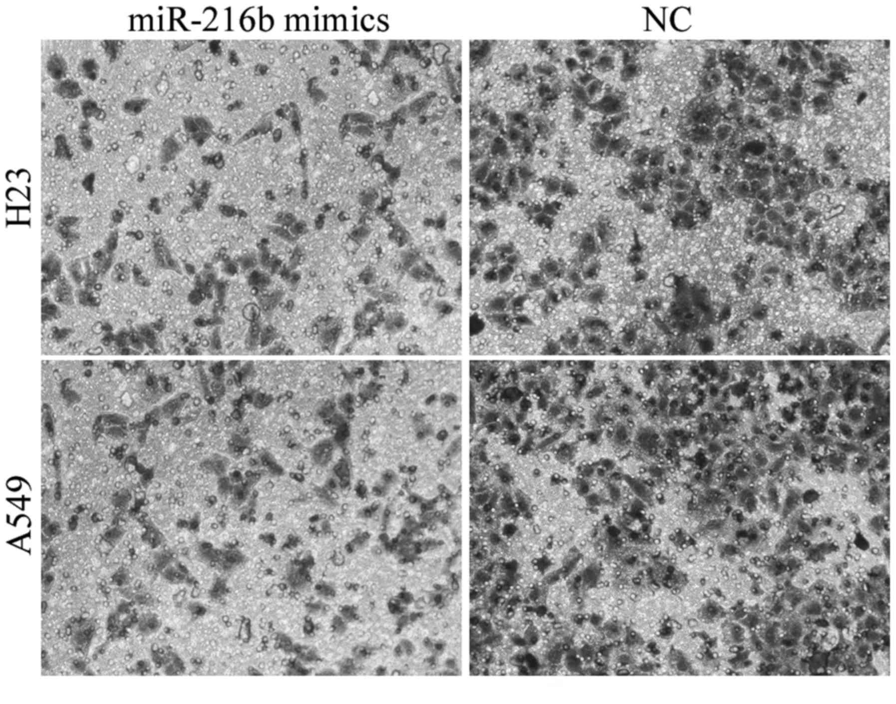 Invasion capacity is essential for cancer cell metastasis. Therefore, the effect of miR-216b on the invasion capacity of NSCLC cells was evaluated. The invasion assay revealed that cell invasion capacity was markedly reduced in the miR-216b mimic-treated H23 and A549 cells compared with the NC groups, as illustrated in Fig. 3. These findings indicate that miR-216b was downregulated in NSCLC, and acted as a tumor suppressor in NSCLC proliferation and invasion.