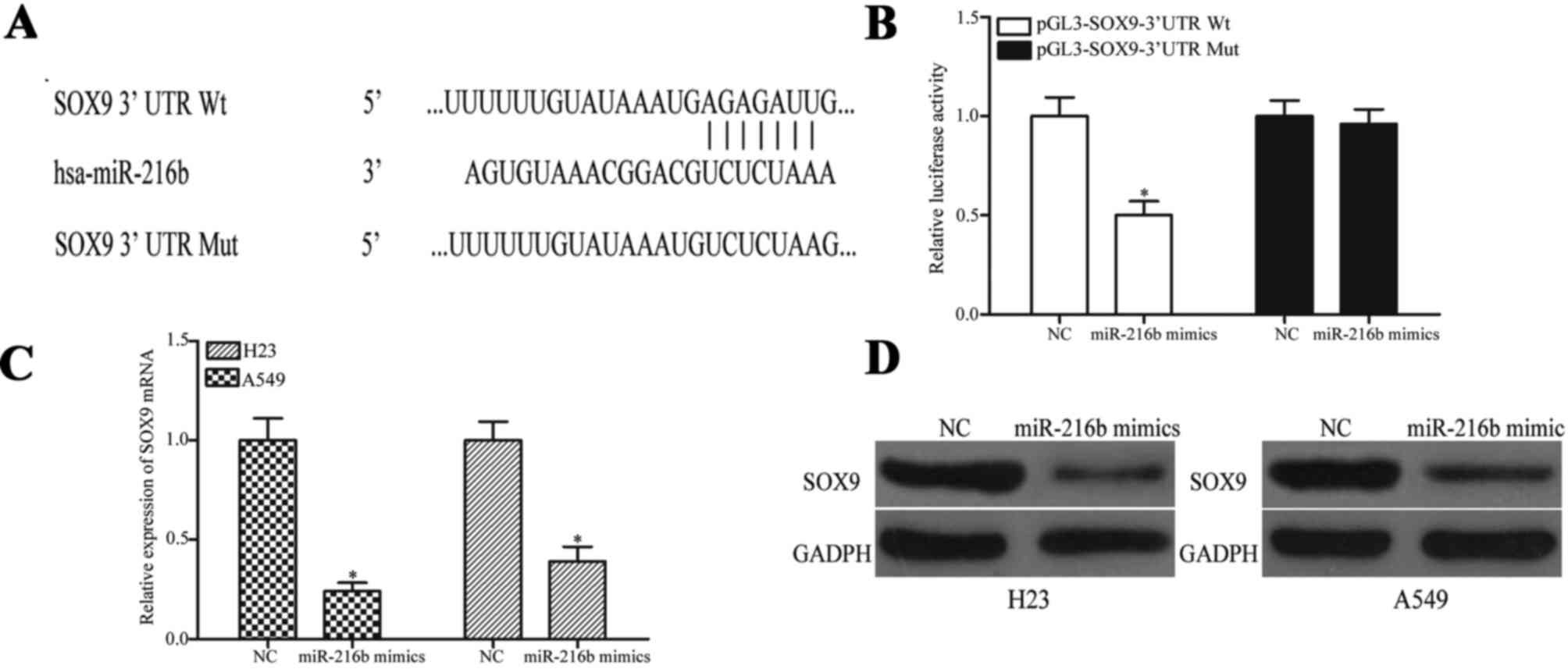 Also, in the present study the molecular mechanism of miR-216b-inhibited proliferation and invasion of NSCLC cells was investigated. Online bioinformatics analysis demonstrated that SOX9 was a potential target gene of miR-216b. In order to test whether miR-216b directly participates in the regulation of SOX9 gene expression, luciferase report assays were performed. By measuring changes in the luciferase activity, the regulation of SOX9 by miR-216b was demonstrated. In addition, RT-qPCR and western blot analysis revealed that SOX9 expression at the mRNA and protein levels were downregulated by miR-216b overexpression. In addition, SOX9 knockdown may mimic miR-216b-induced proliferation and invasion of NSCLC cells. These results demonstrate that miRNA-216b inhibited the proliferation and invasion of NSCLC cells through negatively regulating the expression of SOX9 by directly targeting the 3′UTR.