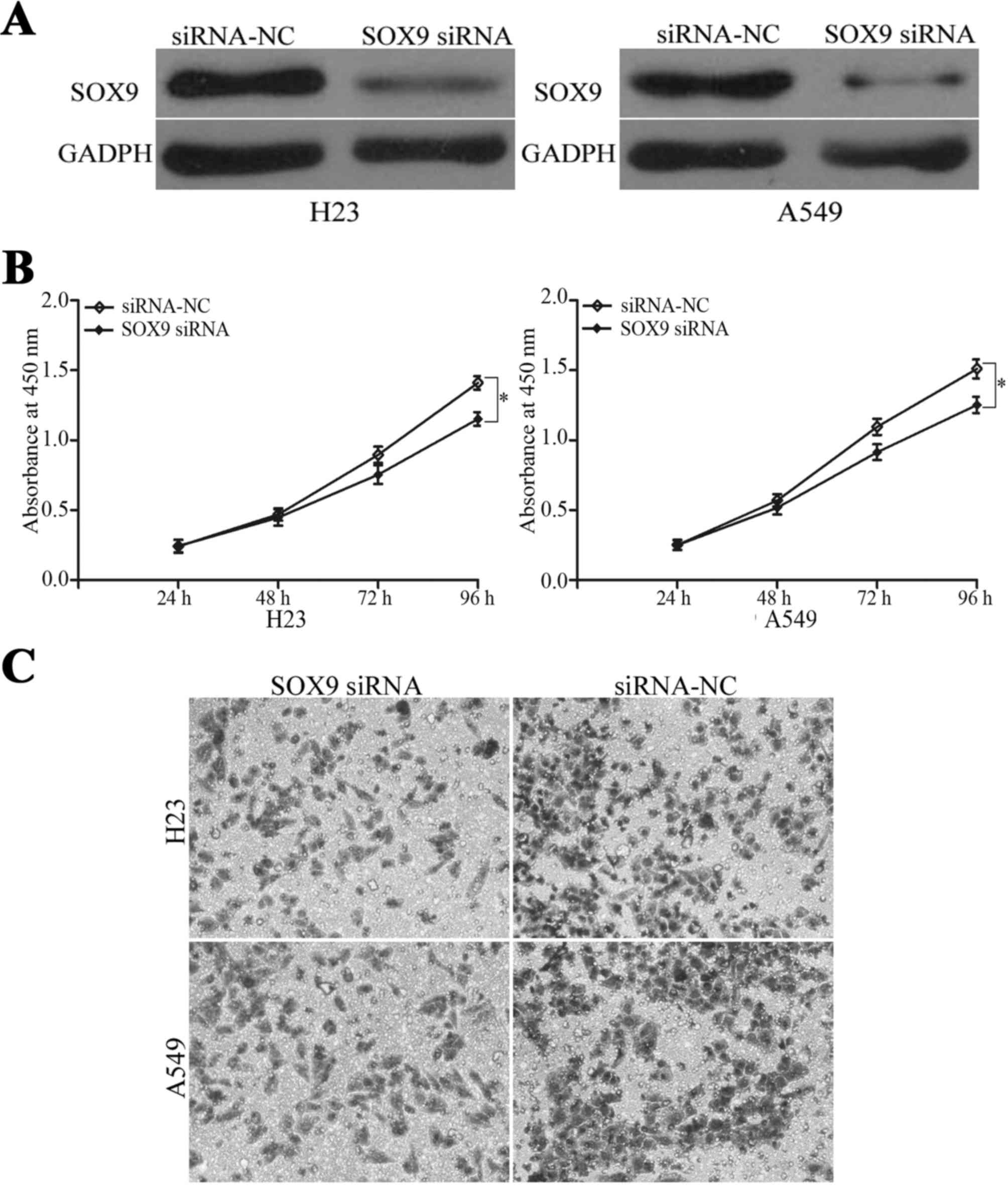 Wang X, Ju Y, Zhou MI, Liu X and Zhou C: Upregulation of SOX9 promotes cell proliferation, migration and invasion in lung adenocarcinoma. Oncol Lett. 10:990–994. 2015. View Article : Google Scholar : PubMed/NCBI | |