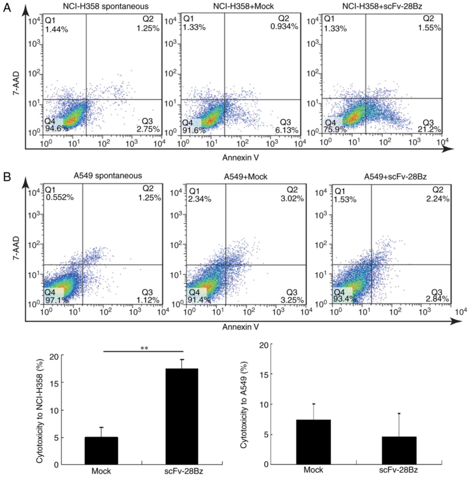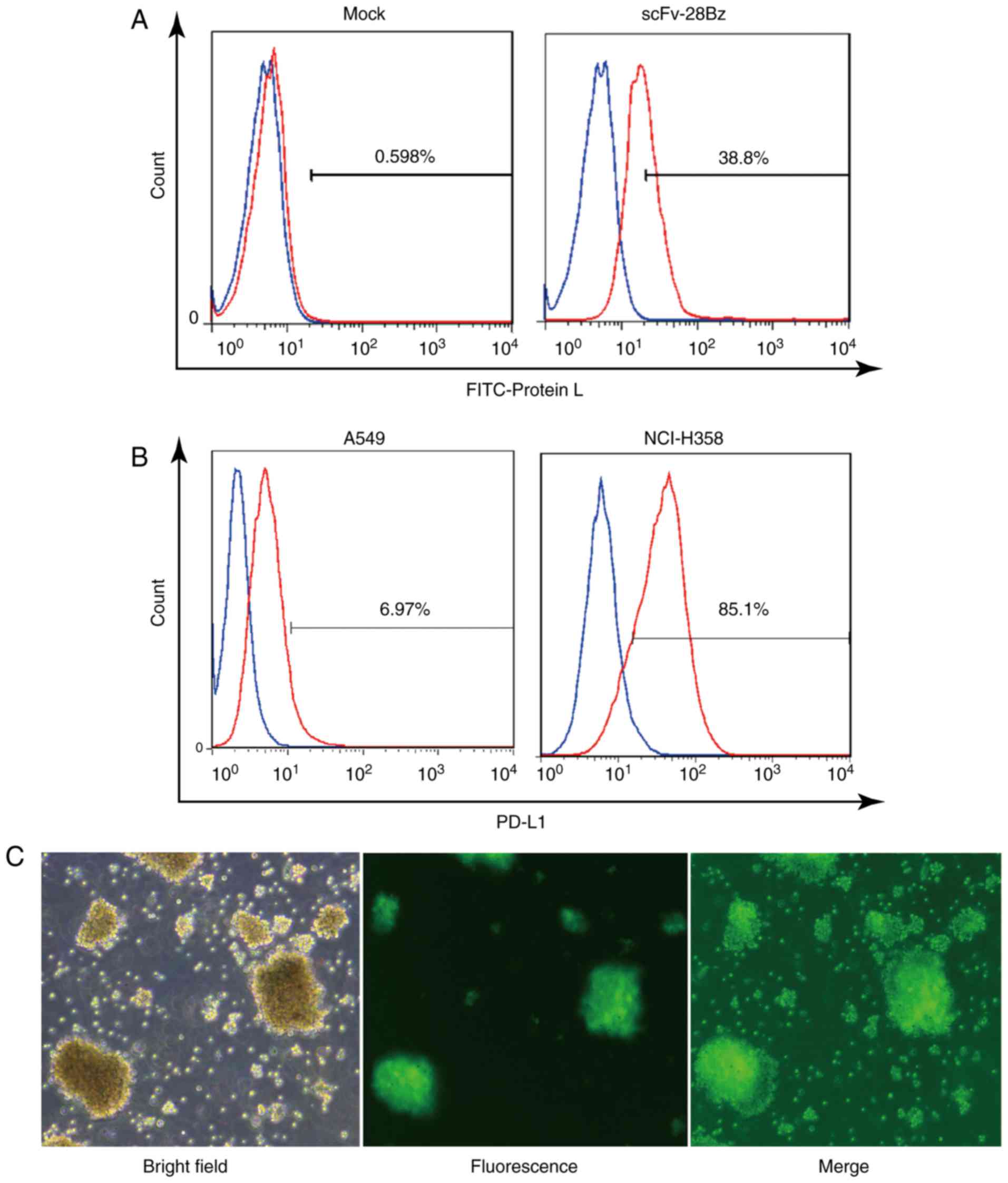 As reported previously, the protein L has the ability to bind to the κ light chain of antibodies (48). Flow cytometry was used to confirm the expression of scFv-28Bz using the FITC-Protein-L reagent (cat no. RPL-PF141; ACROBiosystems). PBMCs (~2 million) were harvested using centrifugation at 300 × g for 10 min at 25°C, washed twice with phosphate-buffered saline (PBS) and incubated with 2 µg FITC-Protein-L protein at room temperature for 1 h in the absence of light, with FITC-Protein-L-stained mock cells serving as the isotype control. Subsequently, the cells were washed three times in PBS containing 0.5% bovine serum albumin (BSA). NCI-H358 and A549 cells (~2 million) were harvested by digestion with trypsin and washed twice with PBS. The cell lines were incubated with 2 µg phycoerythrin (PE)-anti-PD-L1 (PE anti-human CD274 Antibody; 1:10, cat no. 329706) at room temperature for 30 min, prior to being washed three times in PBS containing 0.5% BSA. The cells were analyzed with a BD FACSCalibur flow cytometer and the results were analyzed with FlowJo software 7.6.1 (FlowJo LLC, Ashland, OR, USA).