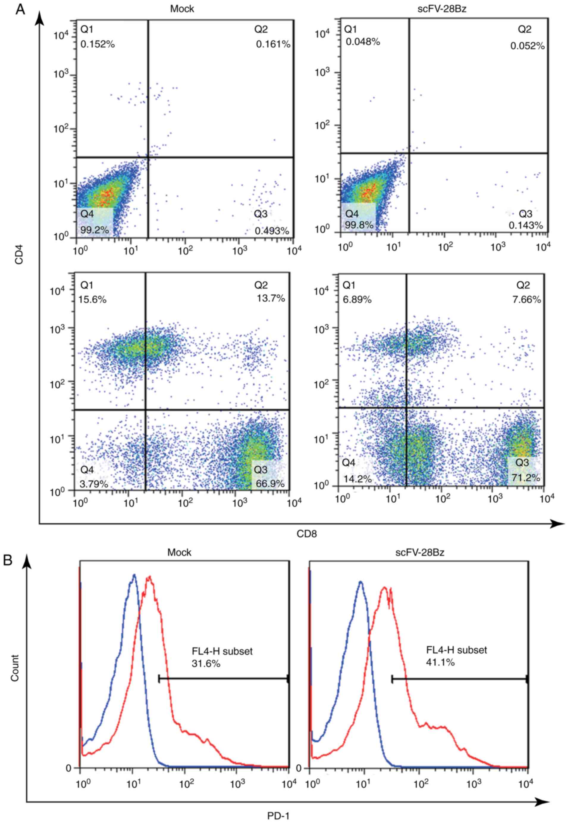 On day 14 post-transduction, the cells were collected to analyze the subsets of CD4+ and CD8+ cells and the expression of PD-1. As depicted in Fig. 3A, the CD4+ subset accounted for 10–30% of the total number of cells, and the CD8+ subset accounted for 70–90% of the total number of cells. The expression of PD-1 was 30–50%, as depicted in Fig. 3B.