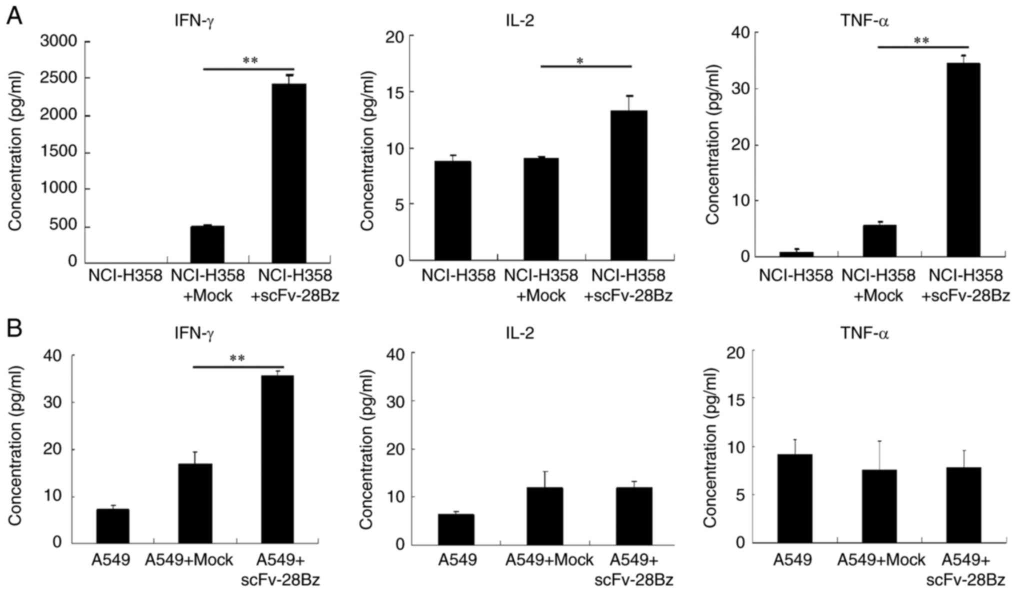 The results revealed that the co-culture of transduced T cells with NCI-H358 cells induced significantly increased production of IFN-γ, compared with mock T cells with NCI-H358 (P<0.01; Fig. 4A), but the levels of IL-2 and TNF-α were low. The levels of cytokines in the supernatants of co-cultured cells with A549 cells were <40 pg/ml (Fig. 4B).