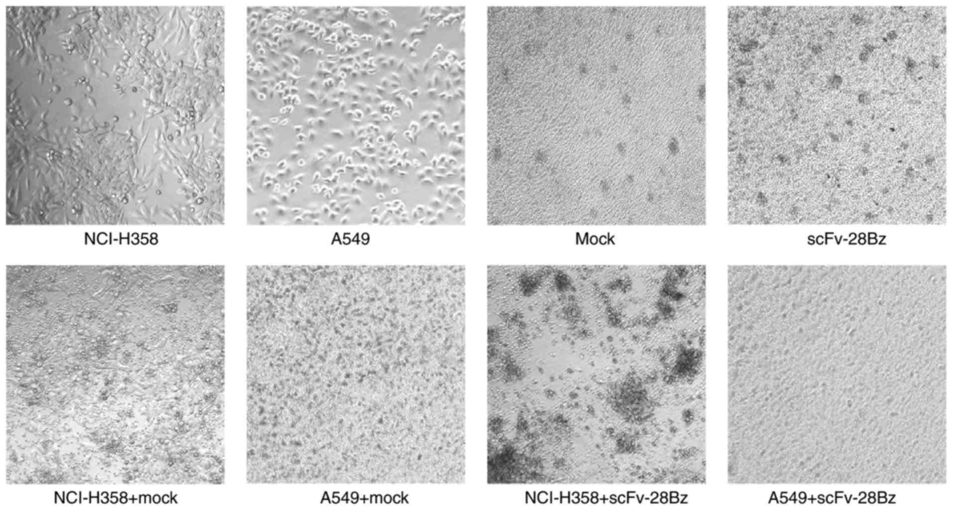 The cytotoxicity percentages of mock and scFv-28Bz T cells against NCI-H358 cells were 5±1.7 and 17.3±1.8%, respectively (Fig. 5A), and scFv-28Bz was significantly higher, compared with the mock control group (P<0.01). The cytotoxicity percentages of mock and scFv-28Bz T cells against A549 cells were 7.3±2.77 and 4.5±3.96%, respectively, and there was no significant difference between these groups (Fig. 5B). The morphology of co-cultured cells also demonstrated specific cytotoxicity of CAR-T cells against PD-L1+ NCI-H358 cells, but no significant effect on A549 cells expressing low PD-L1 levels (Fig. 6).