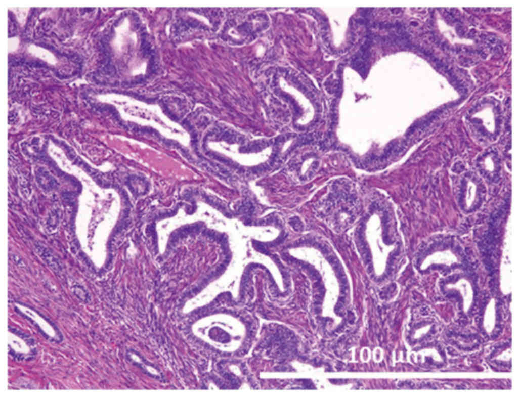 Gross observations of the tumor of the right ovary revealed that it had a maximum diameter of 7.5 cm. Microscopically, the tumor was categorized as having an endometrioid adenofibromatous growth pattern. Numerous glands with intervening fibrous stroma were observed and these glands demonstrated varying degrees of endometrial hyperplasia, ranging from simple hyperplasia to a more marked proliferation, similar to that observed in complex atypical hyperplasia (Fig. 1). No invasion of the ovarian stroma was identified.