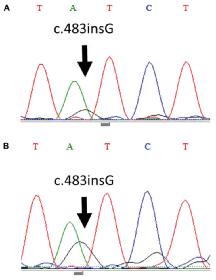 PCR amplification and sequence analysis were performed for the borderline regions in case 1 tissue samples, and in the benign and borderline regions in the case 2 tissue samples. The borderline regions of both samples were revealed to harbor a c.483insG mutation in exon 8 of the PTEN gene (Fig. 6). Regarding the regions of endometriosis without atypia, the same mutations were detected. c.483insG represents a frameshift mutation that results in the formation of a stop codon (p.ASP485X) for PTEN protein translation.