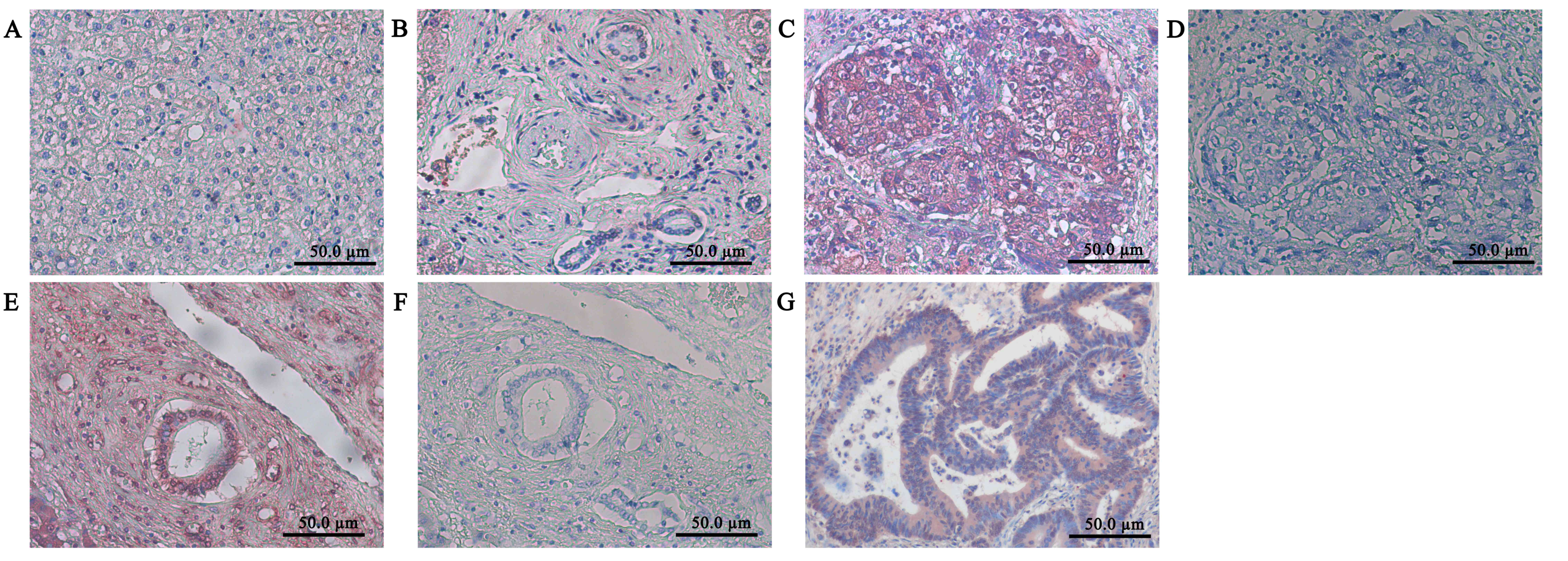 Paraffin-embedded human liver and colorectal carcinoma tissues were obtained from the Second Affiliated Hospital of Shantou Medical College (Shantou, China). Samples were collected from consecutive patients undergoing surgical resection for HCC (n=23), hepatic metastatic adenoma [n=2; 1 male, 1 female, age range 50–52 years (mean, 51.00±1.41)] and colorectal carcinoma [n=5; 4 males, 1 female, age range 54–78 years (mean, 64.80±11.30)]. Histologically normal liver tissues were collected from patients undergoing resection for other carcinomas [n=4; 3 males, 1 female, age range 54–78 years (mean, 62.00±10.86)], and served as controls. The population of patients with HCC included 21 men and 2 women ranging in age between 37–78 years (mean, 50.04±2.45). HCC was histologically confirmed, and tumor staging was performed using the Cancer of the Liver Italian Program (CLIP; which incorporates Child stage, tumor morphology, AFP levels, and the presence of portal vein thrombosis) system (28). Patient characteristics are summarized in Table I; no patients had received preoperative chemotherapy. The Ethical Committees of the Second Affiliated Hospital of Shantou Medical College and the Medical College of Shantou University approved the present study, and all patients provided written informed consent.