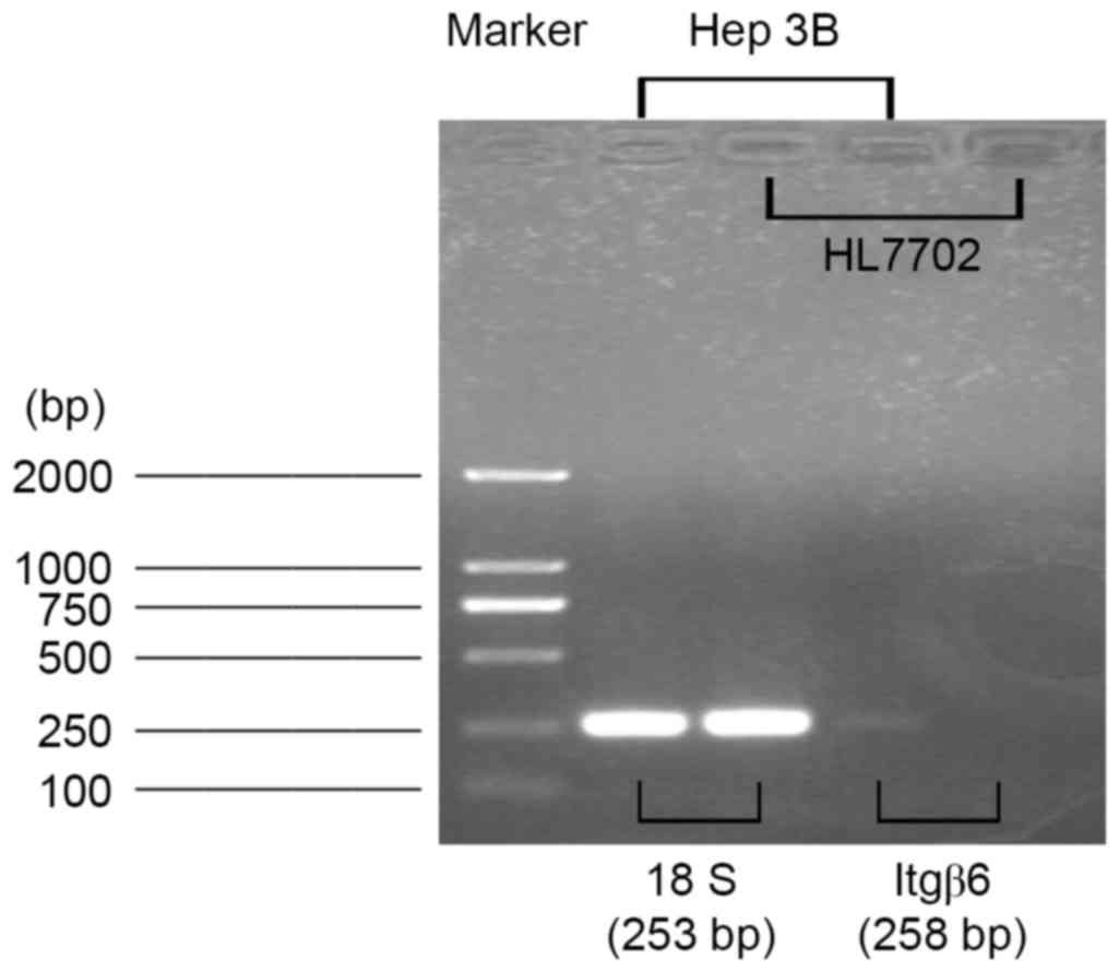 Immunoreactivity for Itgβ6 was absent in normal liver tissue, liver cells, and intrahepatic bile ducts, which was similar to the negative controls (Fig. 1A and B). In contrast, strong staining was present in the nests and intrahepatic bile ducts of the HCC samples (Fig. 1C and D); blank controls are presented in Fig. 1E and F. Itgβ6 immunoreactivity was present in the positive control colorectal carcinoma sections (Fig. 1G) and detected in hepatic metastases adenoma samples (data not shown). The expression of Itgβ6 was measured at mRNA levels in the human normal hepatocyte HL-7702 and human hepatic cancer Hep-3B cell lines. Itgβ6 mRNA was detected in Hep-3B cells, but Itgβ6 expression was not detected in HL-7702 cells (Fig. 2).