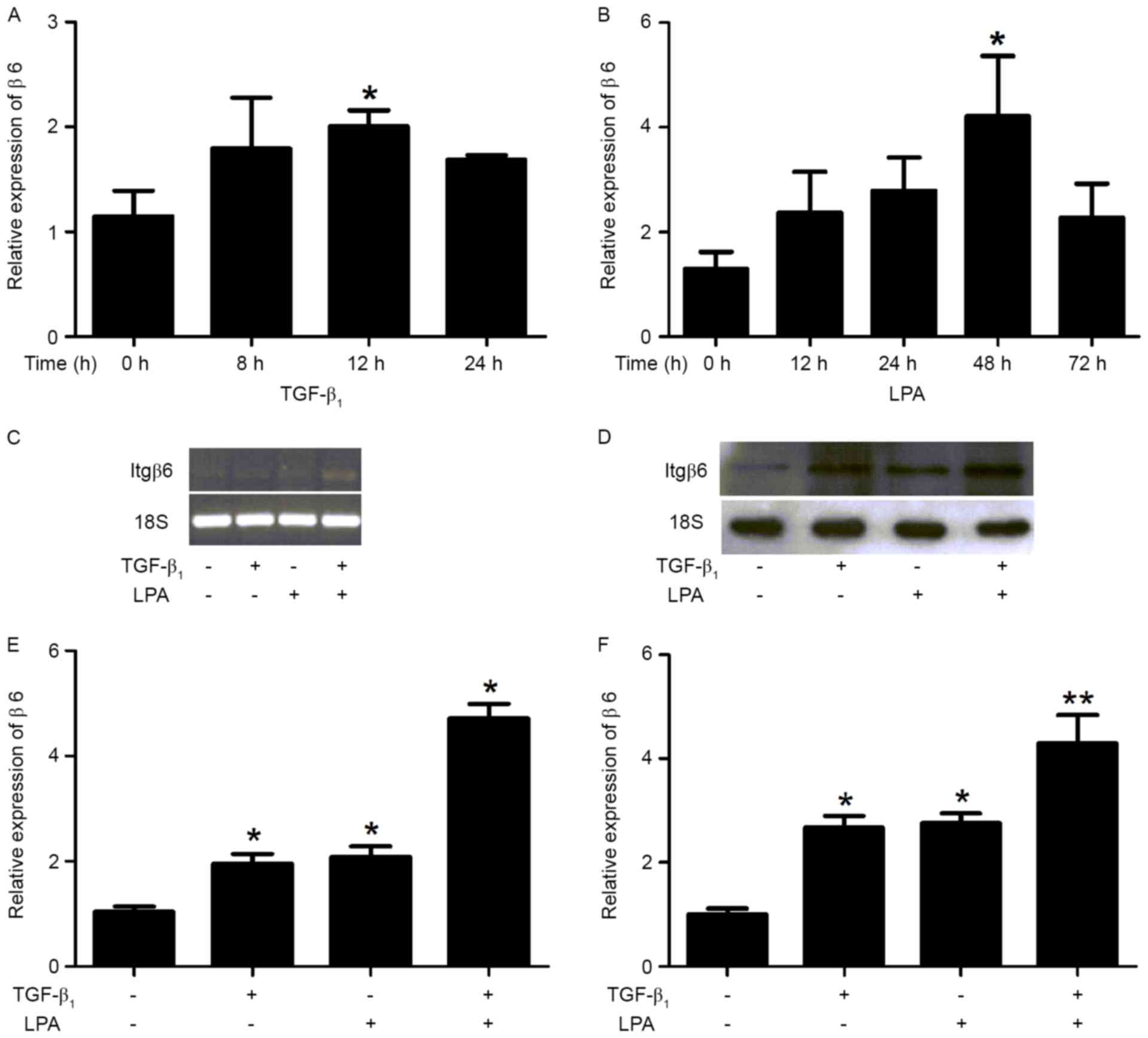Hep-3B cells were stimulated with either: i) TGF-β1 (5 ng/ml) for 8, 12 and 24 h; ii) LPA (10 µM) for 12, 24, 48 and 72 h; iii) DMEM/0.1% bovine serum albumin (BSA) alone (serving as a negative control) in 6 well plates. Hep-3B cells were stimulated with either TGF-β (5 ng/ml) for 8 h, LPA (10 µM) for 24 h, TGF-β (5 ng/ml) for 8 h + LPA (10 µM) for 24 h, or DMEM/0.1% BSA alone (serving as a negative control) in 6 well plates. Total RNA was extracted using universal RNA Pure reagent (Guangzhou Dongsheng Biotech, Guangzhou, China) according to the manufacturer's protocol. PCR conditions were: 94°C for 2 min, followed by 35–40 cycles of 94°C for 30 sec, 58°C for 30 sec and 72°C for 1 min, finished at 72°C for 5–10 min. Template cDNA was obtained using reverse transcription of 1 µg of the total RNA with EasyScript First-Strand cDNA Synthesis SuperMix (Beijing TransGen Biotech Co., Ltd., Beijing, China), and relative transcript levels were quantified using qPCR on an ABI PRISM® 7300 Fast Real-Time PCR System (Applied Biosystems; Thermo Fisher Scientific, Inc.), according to the manufacturer's protocol. The expression of Itgβ6 and the housekeeping gene human 18s rRNA (18s) gene were determined using the primer sequences: Itgβ6 forward primer 5′-GCAAGCTGCTGTGTGTAAGGAA-3′ and reverse primer 5′-CTTGGGTTACAGCGAAGATCAA-3′; 18s forward primer 5′-TTGGTGGAGCGATTTGTCTG-3′ and reverse primer 5′-AATGGGGTTCAACGGGTTAC-3′. Itgβ6 and 18s transcripts were amplified using the SYBR® Premix Ex Taq™ kit (Takara Biotechnology Co., Ltd., Dalian, China), according to manufacturer's protocol. The thermocycler conditions were as follows: Initial denaturation at 94°C for 30 sec, followed by 40 cycles of 95°C for 5 sec and 60°C for 30 sec. The relative expression levels of Itgβ6 mRNAs were determined using the comparative cycle threshold (Cq) method (29) that utilized 18s as the endogenous control. Quantity One 4.4 (Bio-Rad Laboratories, Inc., Hercules, CA, USA) was used for analysis.