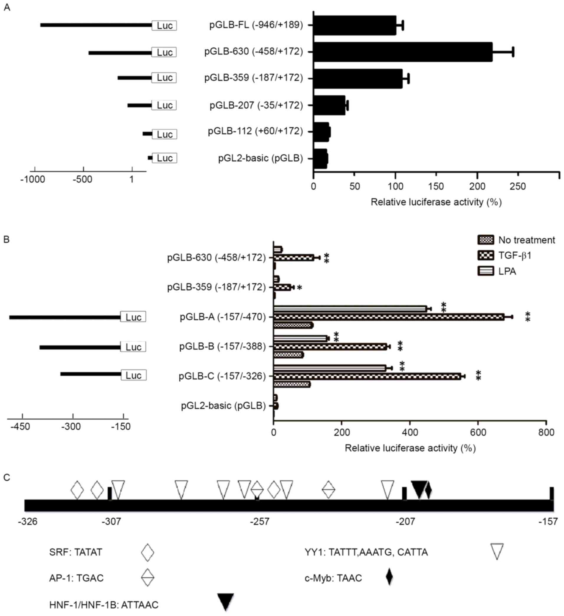 To confirm that TGF-β1 and LPA induce transcriptional activation of the human Itgβ6 gene, the Itgβ6 promoter was cloned and luciferase reporter gene assays measured the activity by the generation of a series of Itgβ6 promoter deletion mutants. Hep-3B cells were transiently transfected with pGLB-112, pGLB-207, pGLB-359, pGLB-630, pGLB-FL, and pGL2-basic (pGLB, control). The pGLB-630 (−458/+172 bp region) was identified to stimulate the maximal luciferase activity (Fig. 4A). Sequence deletion from −458 to −187 bp resulted in an ~50% reduction in luciferase activity. To investigate the role of the specific regions in stimulation of Itgβ6 promoter activity, the region from −470 to −157 bp (containing −458 to −187 bp) was amplified, and additional deletion constructs were generated for the region and named pGLB-A (−470/-157 bp), pGLB-B (−388/-157 bp), and pGLB-C (−326/-157 bp). Hep-3B cells were transiently transfected with the plasmids containing these deletion constructs. The transfected cells treated with TGF-β1 or LPA markedly increased luciferase activity (Fig. 4B), thus confirming that TGF-β1 and LPA trigger transcriptional activation of the Itgβ6 gene promoter. Notably, the −326 to −157 bp proximal fragment was identified to be the minimum sequence that retained the full response to TGF-β1 or LPA. Transcriptional Element Search System (TESS; http://www.cbil.upenn.edu/tess) analysis indicated that the cloned fragment contained several well-defined transcription factor-binding sites, including Activator protein (AP-1), transcriptional activator (c-Myb), hepatocyte nuclear factor (HNF)-1/HNF-1B, serum response factor (SRF), and Yin Yang 1 (YY1) that have been implicated in hepatocarcinogenesis (Fig. 4C).