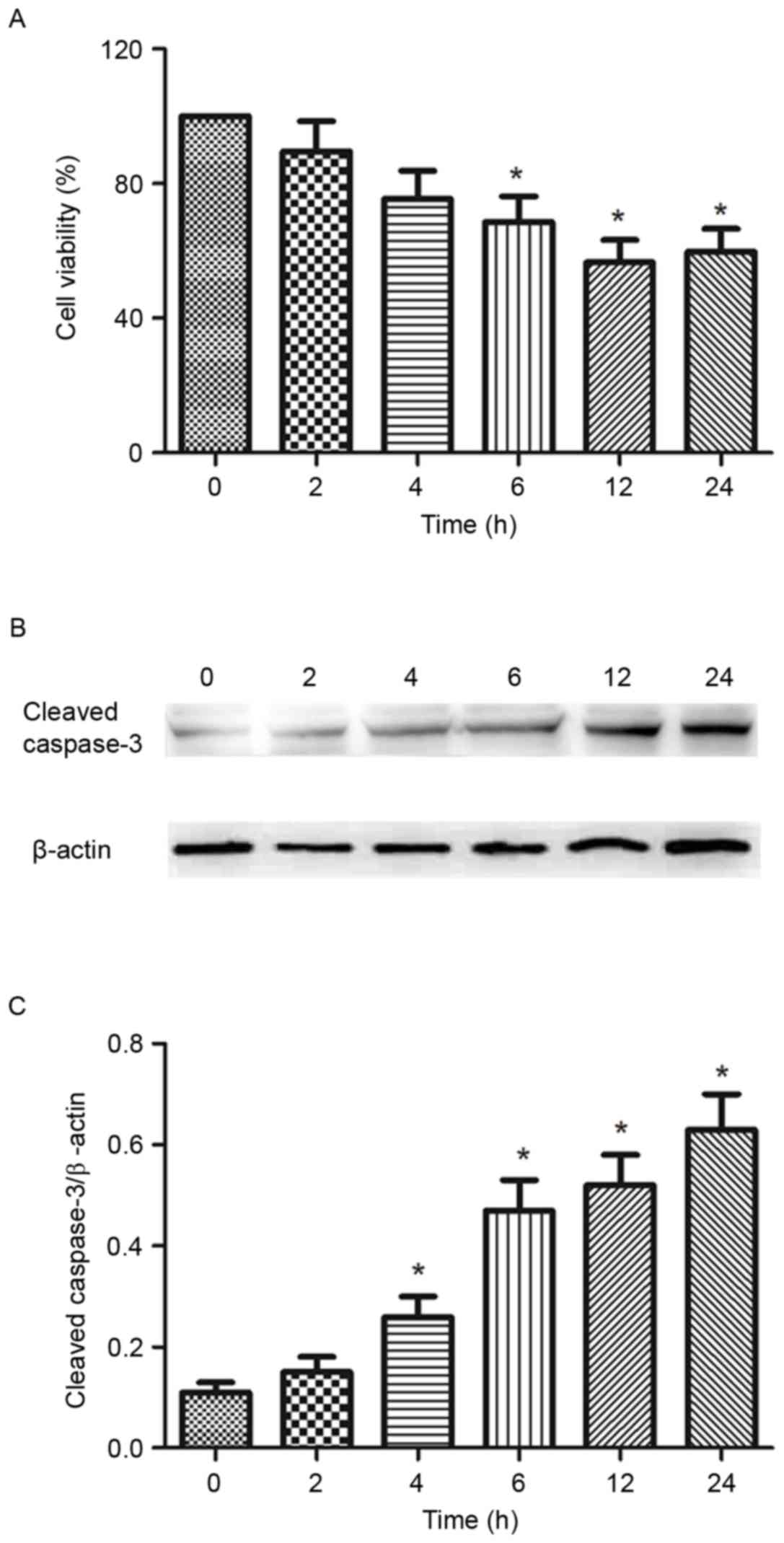 Following the analysis of the results in Fig. 1, 8 Gy was selected to radiate the melanoma cells in subsequent experiments. To investigate the viability of B16-F10 cells following ionizing radiation, cell viability and the levels of cleaved caspase-3 following the exposure to 8 Gy ionizing radiation at 0-24 h were analyzed by MTT assay and western blotting, respectively. The results of the cell viability assay indicated a significant decrease in the number of living cells from 2 to 24 h compared with 0 h, in a time-dependent manner (Fig. 2A). Caspase-3 is crucial mediator of apoptosis. Over the duration of the experiment (24 h), the expression of cleaved caspase-3 was increasingly elevated following exposure to 8 Gy ionizing radiation (Fig. 2B and C).