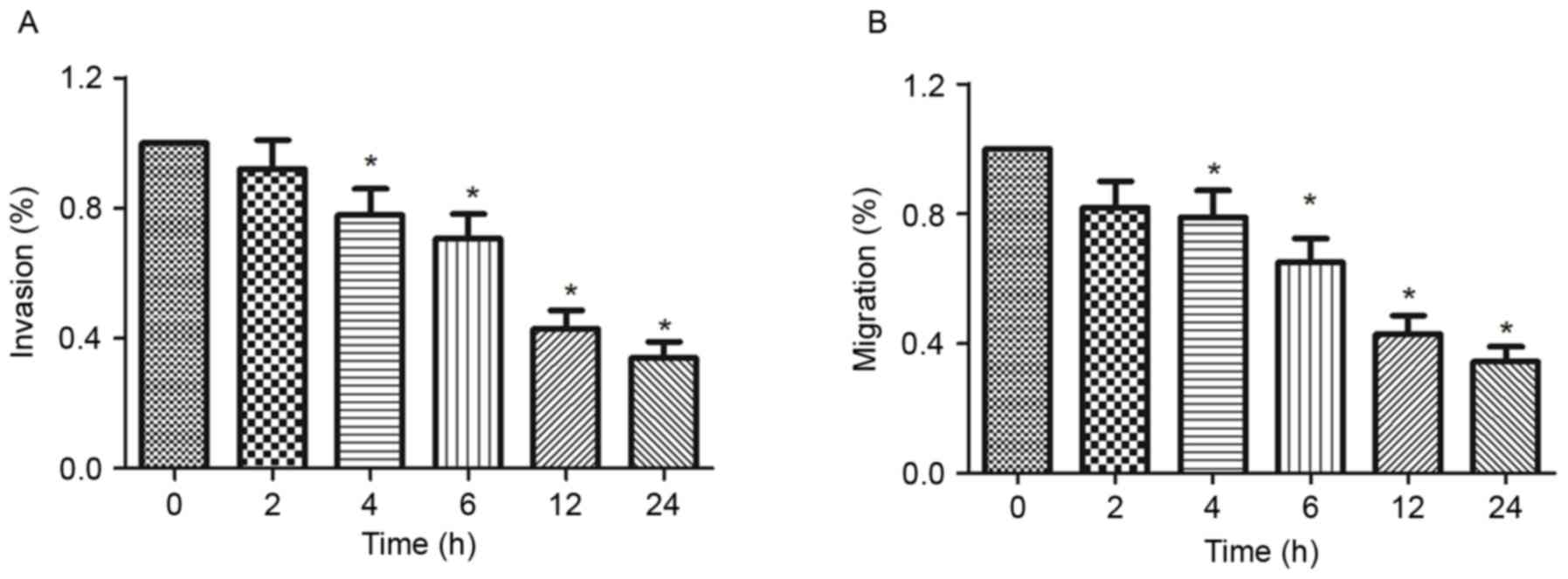Cell migration and invasion serve an important role in cancer metastasis. In the present study, the effect of ionizing radiation on the migration and invasion of melanoma cells was investigated by Transwell chamber and Matrigel invasion assays. The results indicated that the invasive and migratory abilities of B16-F10 cells were inhibited by 8 Gy ionizing radiation compared with the 0 h group (Fig. 3A). The results also indicated that exposure to 8 Gy ionizing radiation inhibited the migration of B16-F10 cells in a time-dependent manner compared with 0 h group (Fig. 3B).