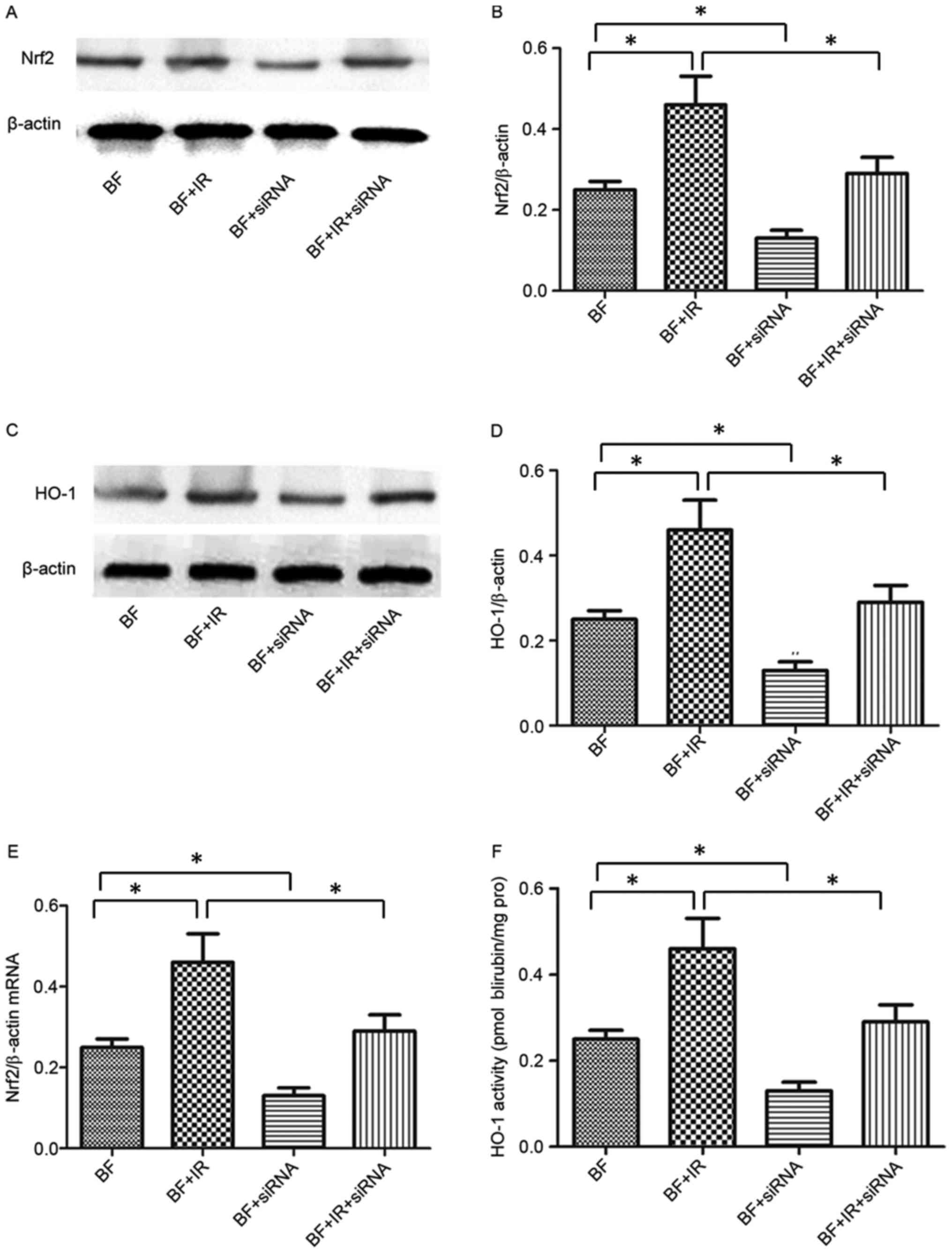 To discuss the role of Nrf2 in melanoma cells following exposure to ionizing radiation, Nrf2 siRNA was utilized to inhibit Nrf2 expression in the present study. The results identified that transfection with Nrf2 siRNA was able to inhibit the expression of Nrf2 protein and mRNA compared with untreated B16-F10 cells (Fig. 4). Furthermore, the combined treatment with Nrf2 siRNA and ionizing radiation significantly inhibited the expression of Nrf2 protein and mRNA in the B16-F10 + IR + siRNA group compared with the B16-F10 + IR group (Fig. 4). To further examine the effect of Nrf2 on its downstream target gene, HO-1, mRNA levels were detected following exposure to IR. Notably, the patterns of HO-1 mRNA expression and changes in the activity of HO-1 were similar to Nrf2 in the four treatment groups (Fig. 4C-F).