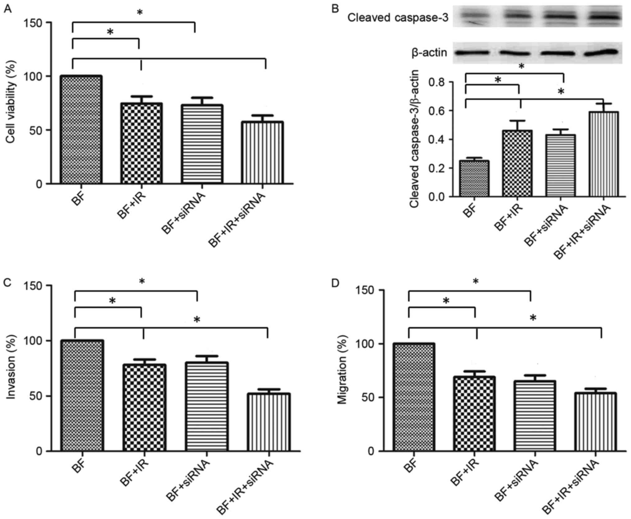Metastasis is a primary cause of cancer-associated mortalities, which accounts for >90%, and includes a multi-step process of cell adhesion, migration and invasion (22). Inhibiting the metastasis of cancer cells is a principal strategy for cancer therapy and research (23). Melanoma, a type of skin tumor, generally has a poor prognosis due to its invasive behavior. The treatments for melanoma include surgery, radiotherapy and chemotherapy (24). Particularly for advanced malignant melanoma, there is currently no effective and safe treatment. In the present research, it was identified that exposure to 8 Gy radiation decreased cell viability and increased the cleaved caspase-3 expression in B16-F10 melanoma cells. Additional experiments verified that radiotherapy exerted an inhibitory effect on the migration and invasion of melanoma cells. These results indicated that radiotherapy exerts an inhibitory effect on cancer metastasis, and therefore it has the potential to improve the survival period of patients with melanoma.