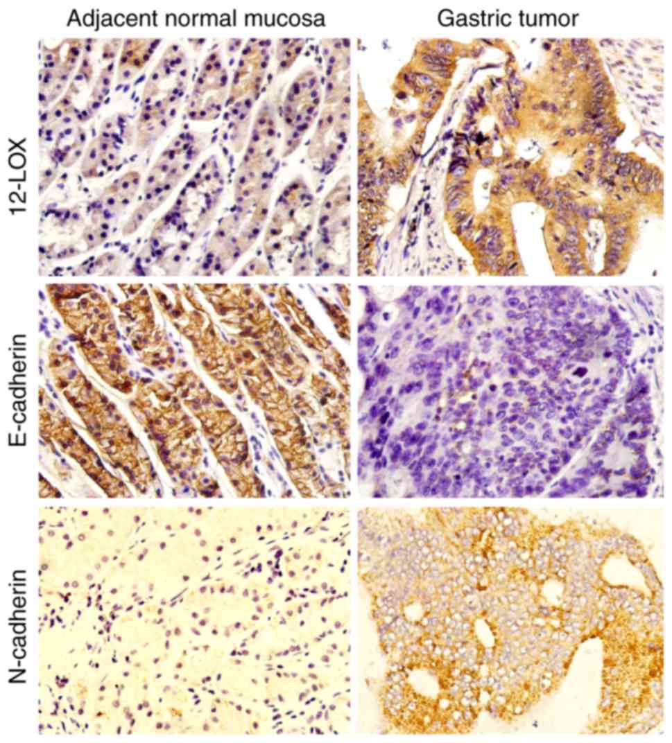 The present study also demonstrated that the expression level of 12-LOX was positively associated with that of N-cadherin in GC tissue. To the best of our knowledge, the regulation of N-cadherin expression by 12-LOX has not been previously reported. N-cadherin is a member of the calcium-dependent cell adhesion molecule family, and a marker of interstitial cells (41). N-cadherin is also a marker of EMT (42,43), and serves a key role in tumor cell migration, invasion and metastasis (44,45). It has been reported that EMT is involved in the invasion and metastasis of GC (46), which indicates that 12-LOX may affect GC progression via EMT.