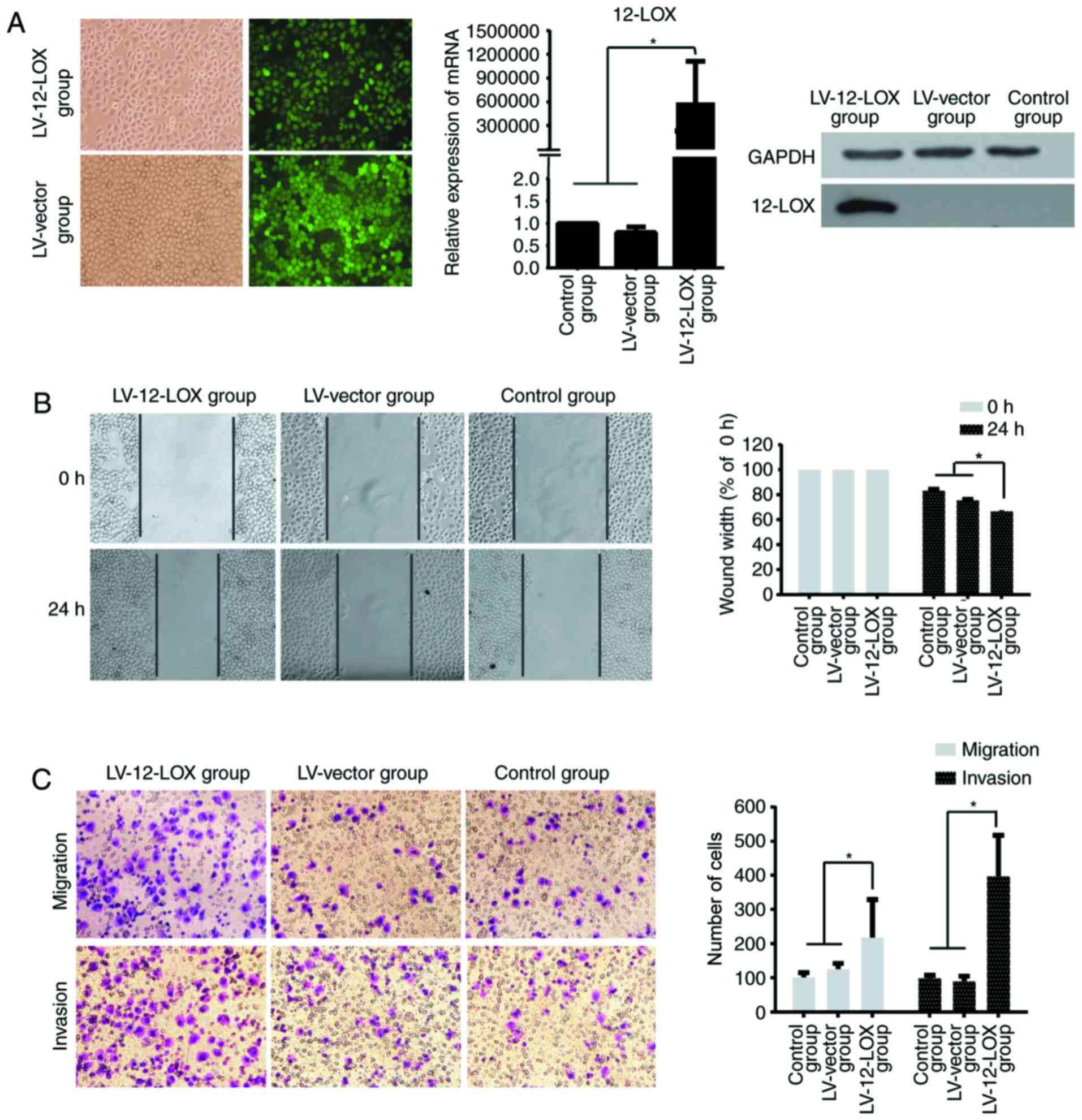 The present study demonstrated that 12-LOX was highly expressed in GC tissue compared with that in adjacent normal gastric mucosa tissue, indicating that 12-LOX overexpression may contribute to GC progression. LV-12-LOX GC cells exhibited significantly enhanced migratory and invasive abilities compared with the LV-vector and control groups. These results indicate that 12-LOX facilitates GC cell migration and invasion and are consistent with previous studies that reported that 12-LOX promotes invasion and metastasis in numerous types of tumor cells (35–37). However, the specific underlying mechanism remains to be elucidated.