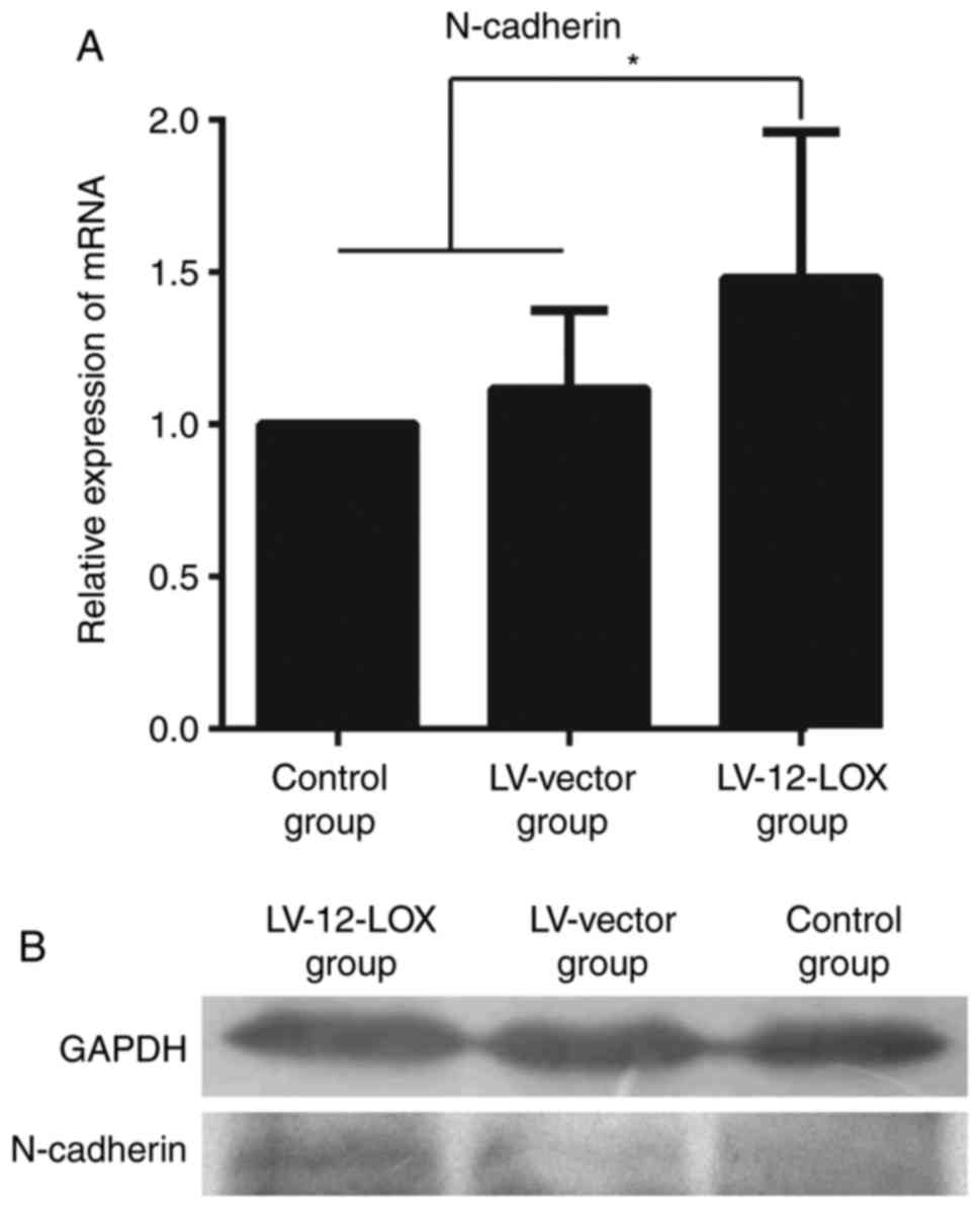 The results of RT-qPCR revealed that the mRNA level of N-cadherin was significantly increased in the LV-12-LOX group compared with that in the LV-vector and control groups (Fig. 3A; P<0.05). Western blotting revealed that the protein expression level of N-cadherin was markedly increased in the LV-12-LOX group compared with that in the LV-vector and control groups (Fig. 3B).