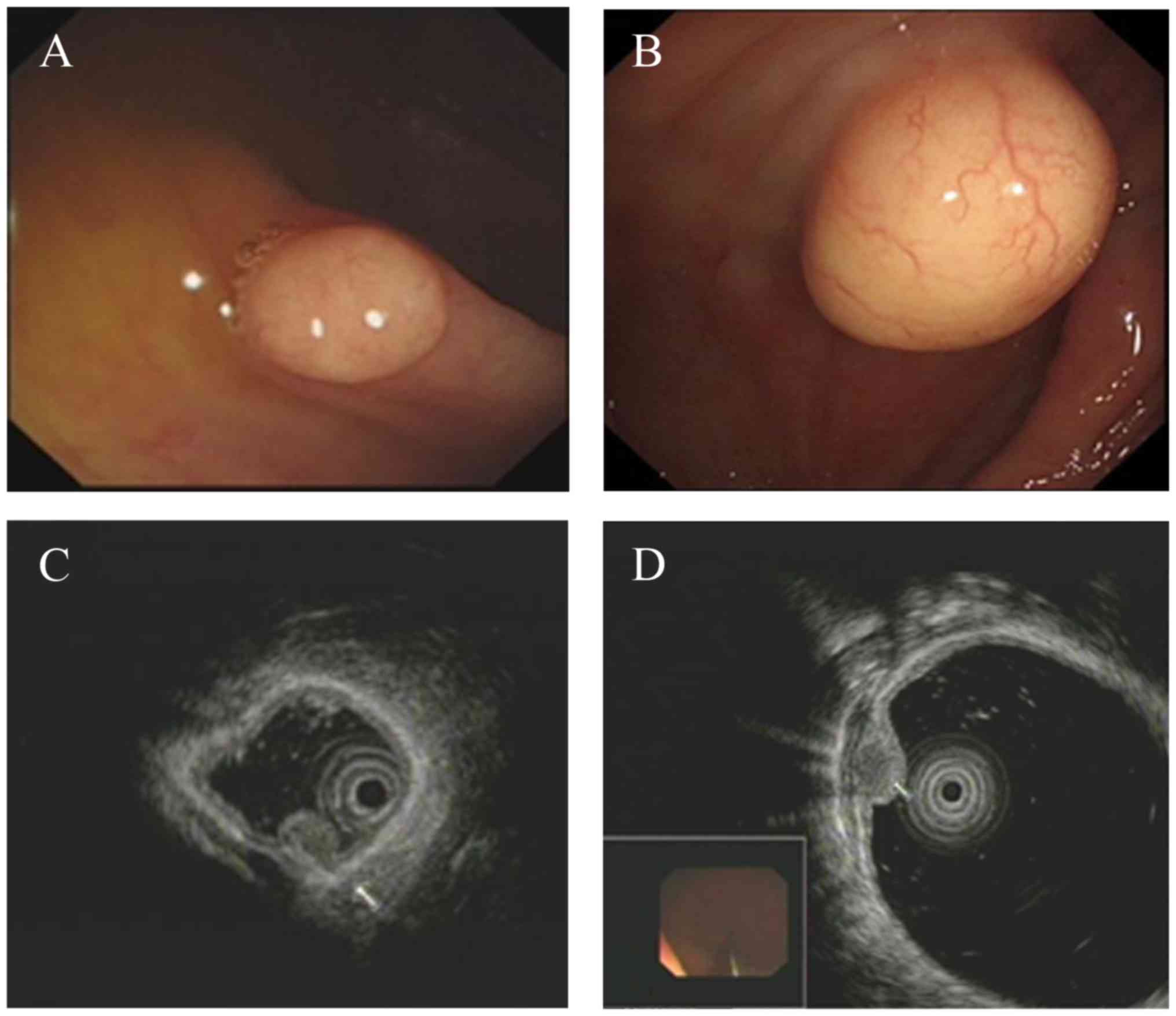 EUS-guided fine needle aspiration is valuable for pathological determination. However, the extracted biopsy tissue is of limited size and the malignant location may be missed, leading to a false diagnosis. Complete resection is the optimal strategy to obtain specimens of submucosal tumors. None of the cases in the present report underwent biopsy, considering that all lesions were submucosal tumors.
