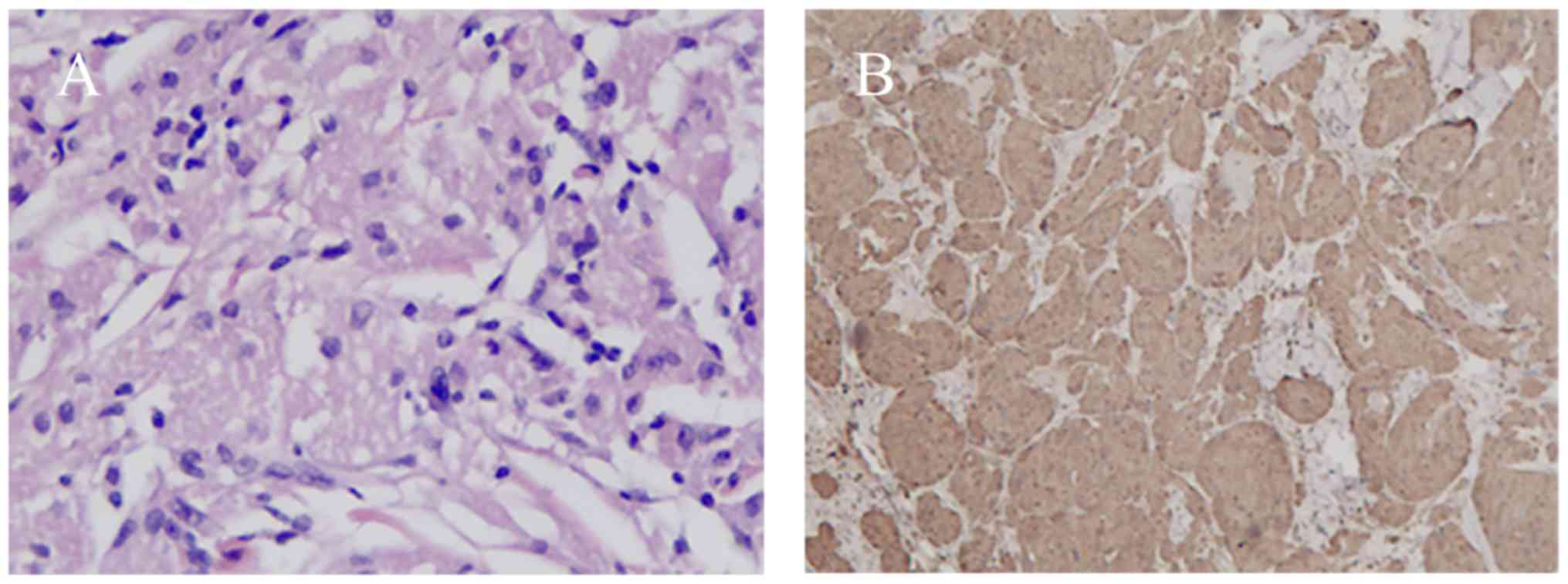 The sex and age distribution of GCT remains controversial in the literature, partially due to cases that were insufficiently described. Singhi et al (14) reported an equal sex distribution, with ages ranging between 31 and 60 years. An et al (15) observed a male predominance, with a wider age distribution between 21 and 75 years. In the present study, the male-to-female ratio was 7:4, with ages ranging between 40 and 67 years.