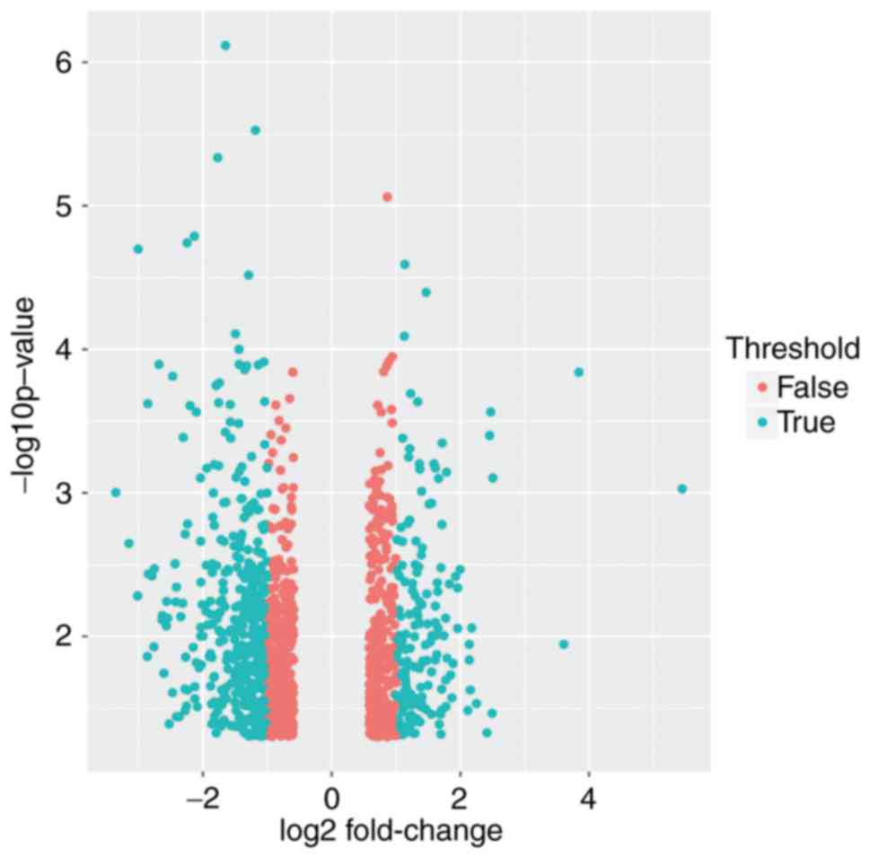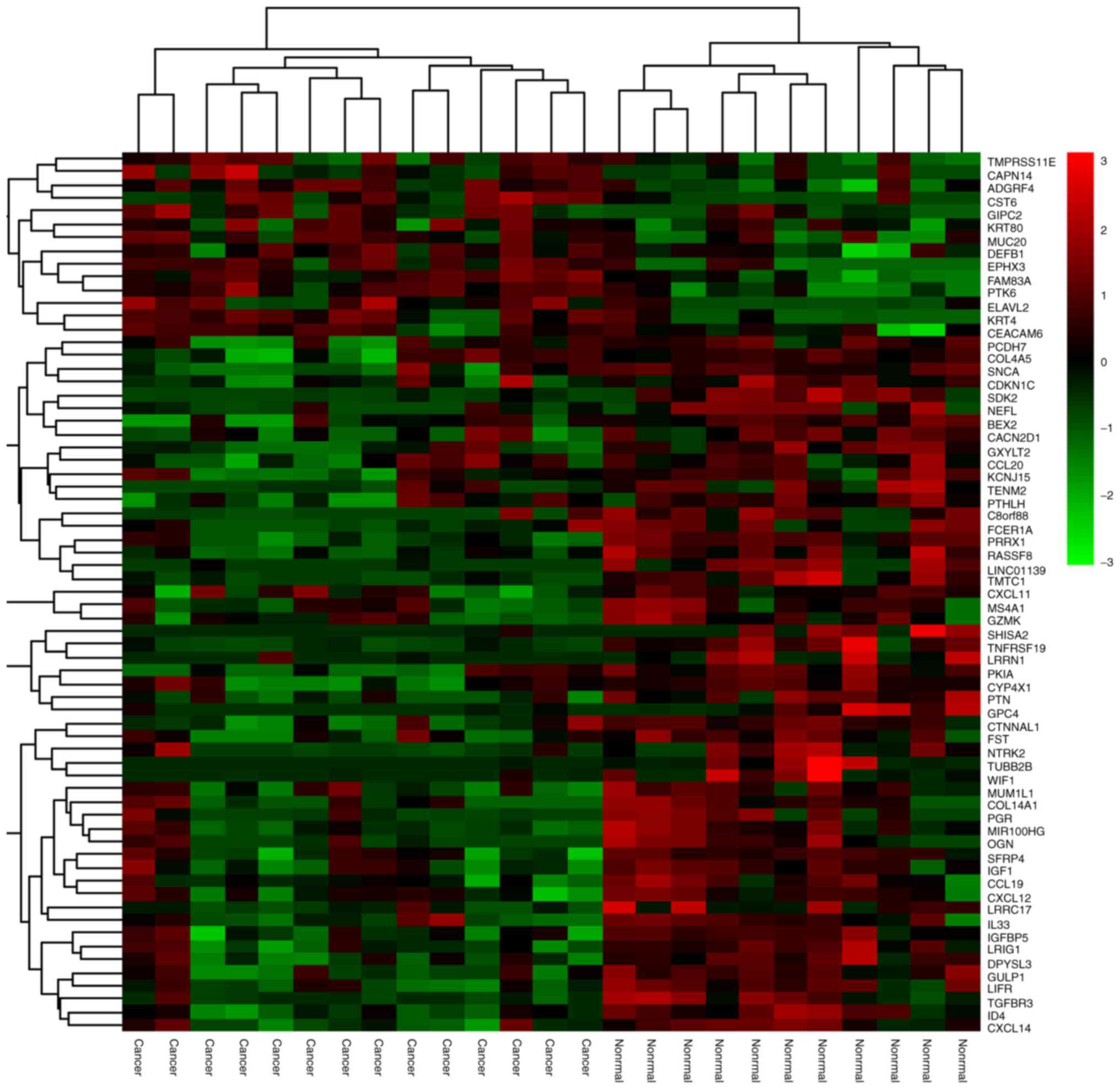 The gene expression profiles of the GSE26511 dataset (14) were downloaded from the GEO database. The GPL570 [HG-U133 Plus 2] Affymetrix Human Genome U133 Plus 2.0 Array platform was used. The GSE26511 dataset contained 39 samples, including 19 cervical cancer samples and 20 normal samples.