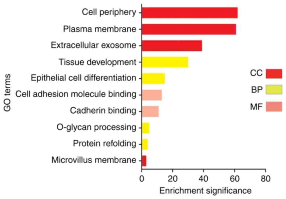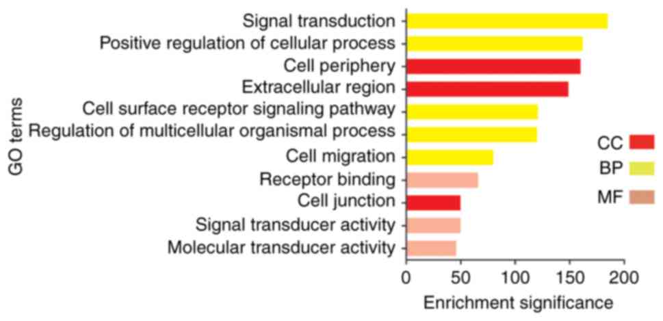 Noordhuis et al (14) performed research mainly concerned with the molecular mechanism of lymph node metastasis in cervical cancer. Pathway analysis of microarray expression profiles suggests that transforming growth factor-β (TGF-β) and p120-associated non-canonical β-catenin pathways are important in pelvic lymph node metastasis of early cervical cancer (14). However, the present results showed that the acquired clean reads were of a sufficiently high quality for subsequent analysis. The upregulated DEGs were primarily enriched in ‘cell adhesion molecule binding’, ‘plasma membrane’, ‘tissue development’, ‘DNA repairing’ and ‘epithelial cell differentiation’. Downregulation of the DEGs was mainly enriched by ‘signal transduction’, ‘cell surface receptor signaling pathway’, ‘positive regulation of biological process’, ‘receptor binding’ and ‘signal transducer activity’. For cellular component, to analyze the biological functions, biological processes and subcellular localization of these DEGs, the upregulated DEGs were enriched in ‘cell periphery’, ‘plasma membrane’ and ‘extracellular exosome’. Subsequent to the scientific analysis, it was found that downregulated genes were mainly found in ‘cell periphery’, ‘extracellular region’ and ‘cell junction’. For biological cell molecular function, the DEGs that were upregulated were significantly enriched in ‘cell adhesion molecule binding’ and ‘cadherin binding’. The DEGs of cervical cancer that were downregulated were significantly enriched in ‘receptor binding’, ‘signal transducer activity’ and ‘molecular transducer activity’. With regard to biological process, it was found that downregulated genes were mainly found in ‘signal transduction’, ‘positive regulation of cellular process’, ‘cell surface receptor signaling pathway’, ‘regulation of multicellular organismal process’ and ‘cell migration’. The upregulated DEGs were primarily enriched in ‘epidermal cell differentiation’, ‘tissue development’ and ‘O-glycan processing’. The analysis clearly and intuitively observed the changes in the enrichment of the DEGs (Figs. 3 and 4).