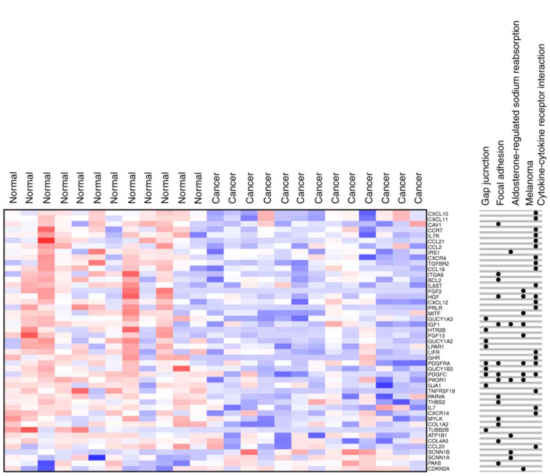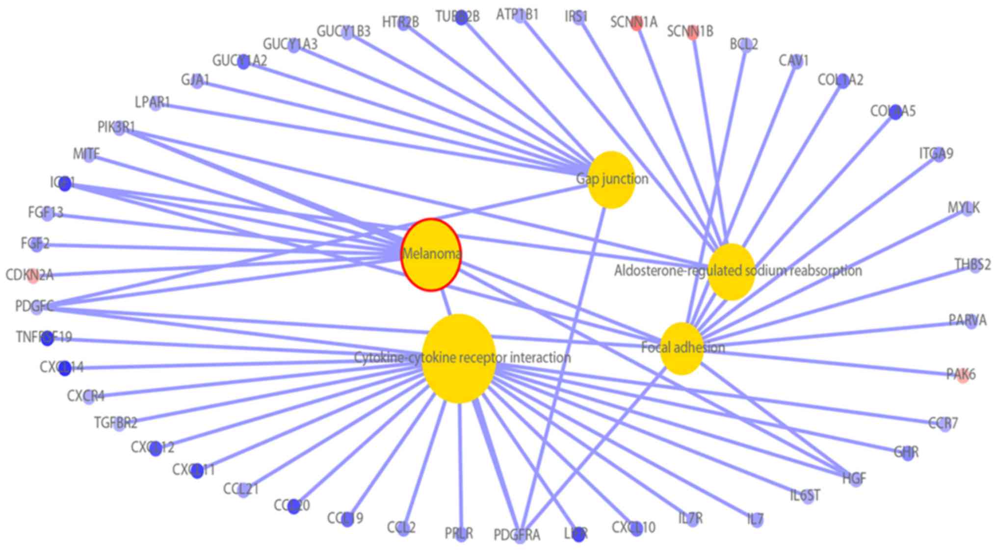 By analyzing the KEGG and Biocarta databases (https://cgap.nci.nih.gov/Pathways/BioCarta_Pathways), Noordhuis et al (14) proved that the five pathways are the TGF-β, nuclear factor of activated T cells (NFAT), anaplastic lymphoma kinase (ALK), Bcl-2-associated death promoter (BAD) and protease-activated receptor-1 (PAR1) pathways. The present study found five significantly enriched pathways by KEGG pathway analysis (Fig. 5). First, the enrichment aspect of ‘aldosterone-regulated sodium reabsorption’ included 4 DEGs that were downregulated and 2 that were upregulated. Second, the enrichment aspect of ‘melanoma’ included 1 upregulated DEG and 8 that were downregulated. Third, the enrichment aspect of ‘gap junction’ included 9 downregulated DEGs. Fourth, the enrichment aspect of ‘cytokine-cytokine receptor interaction’ included 21 downregulated DEGs. Fifth, the enrichment aspect of ‘focal adhesion’ included 1 upregulated DEG and 13 downregulated DEGs. Through the analysis, the molecular mechanism of DEGs was observed in more detail (Fig. 6).