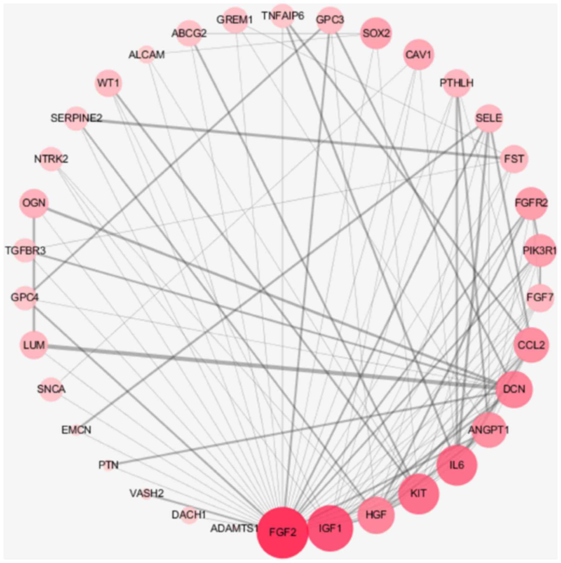 Gene co-expression and the PPI network have a guiding role in the study of cervical cancer target genes and proteins, and have a prominent function in the future study of cervical cancer. Based on the Search Tool for the Retrieval of Interacting Genes/Proteins database, upregulated and downregulated genes were selected to observe the association between protein molecules. The associations between various protein molecules were highlighted, aiding in the observation and understanding of the molecular mechanism of cervical cancer. The upregulation of genes such as FGF2 is associated with tumor formation, and IL6 is associated with immunity (Fig. 7). Downregulated genes such as MUC1 are associated with tumor migration, and FUT3 is associated with the degree of tissue differentiation (Fig. 8).