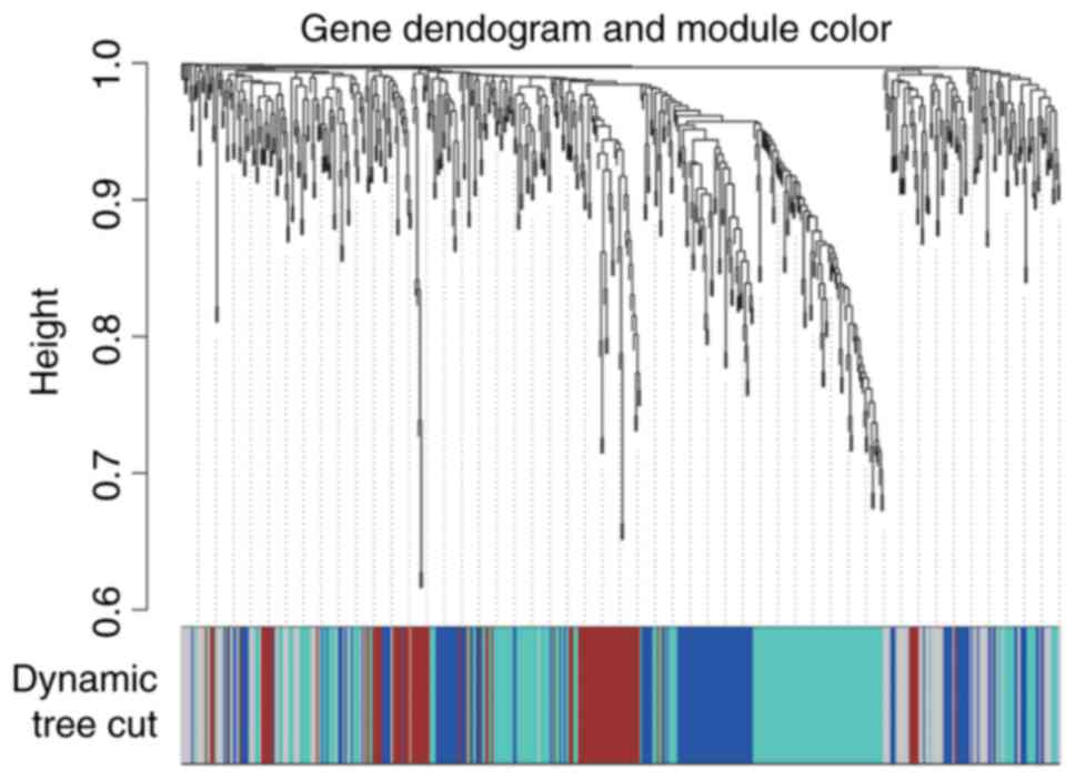 As a system biology method, gene co-expression network analysis was performed by the WGCNA package (http://www.genetics.ucla.edu/labs/horvath/CoexpressionNetwork/Rpackages/WGCNA) to investigate the association between gene expression patterns (15). The clustering criteria of WGCNA were biologically significant, and the consequence of this method is a higher degree of credibility. These results were obtained in order to complete further investigations, such as those into association traits, metabolic pathway modeling and the establishment of gene interaction networks. In a co-expression network, the expression of each gene at a particular time or space was treated as a node. WGCNA uses a soft threshold based on the determination method. Commonly used weighting functions included sigmoid functions and power functions. The similarity and proximity of gene co-expression were calculated using soft threshold power. Analysis of network topology confirmed the final structure of soft threshold power.