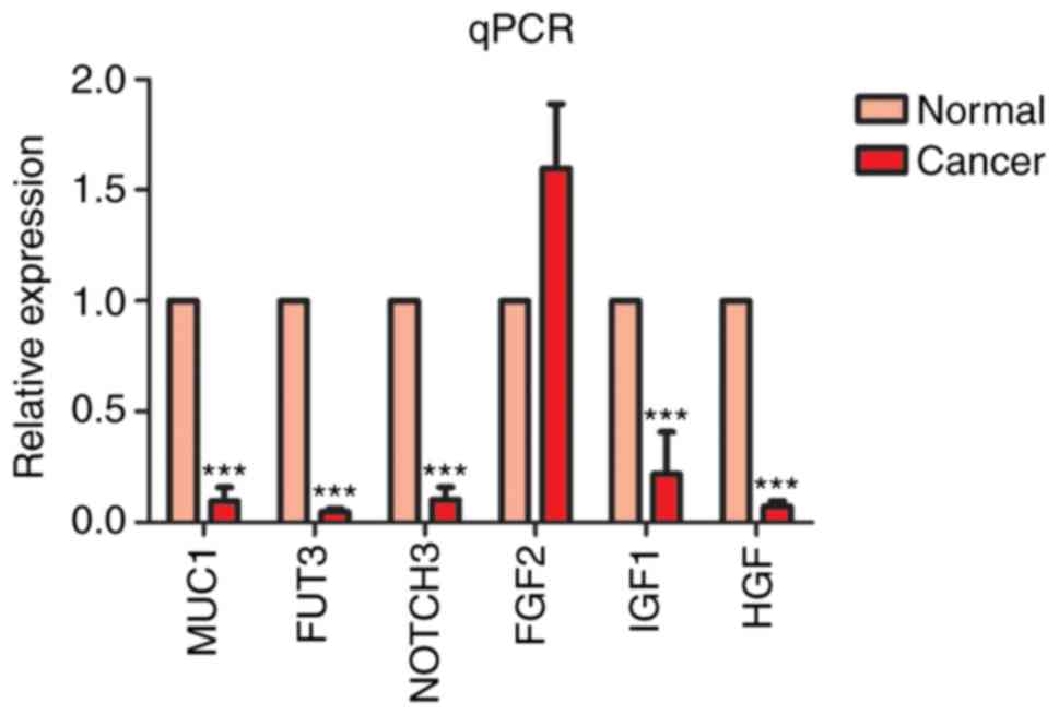 The present study aimed to determine whether the DEGs identified in the microarray analysis were upregulated or downregulated in a sample of clinical cervical cancer patients. Cervical cancer specimens and non-tumor cervical cancer epithelial tissues were obtained, and the differential genes validated with RT-qPCR (Fig. 10). The experimental results showed that MUC1, FUT3 and NOTCH3 gene expression was significantly downregulated, which was consistent with the result of the microarray analysis. However, among the genes found to be upregulated on microarray analysis, IGF1 and HGF were downregulated in the clinical samples. Additionally, FGF2 was upregulated, which confirmed the result of the microarray analysis. The results demonstrated that microarray analysis may provide reference for the identification of molecular markers and therapeutic targets for cervical cancer.