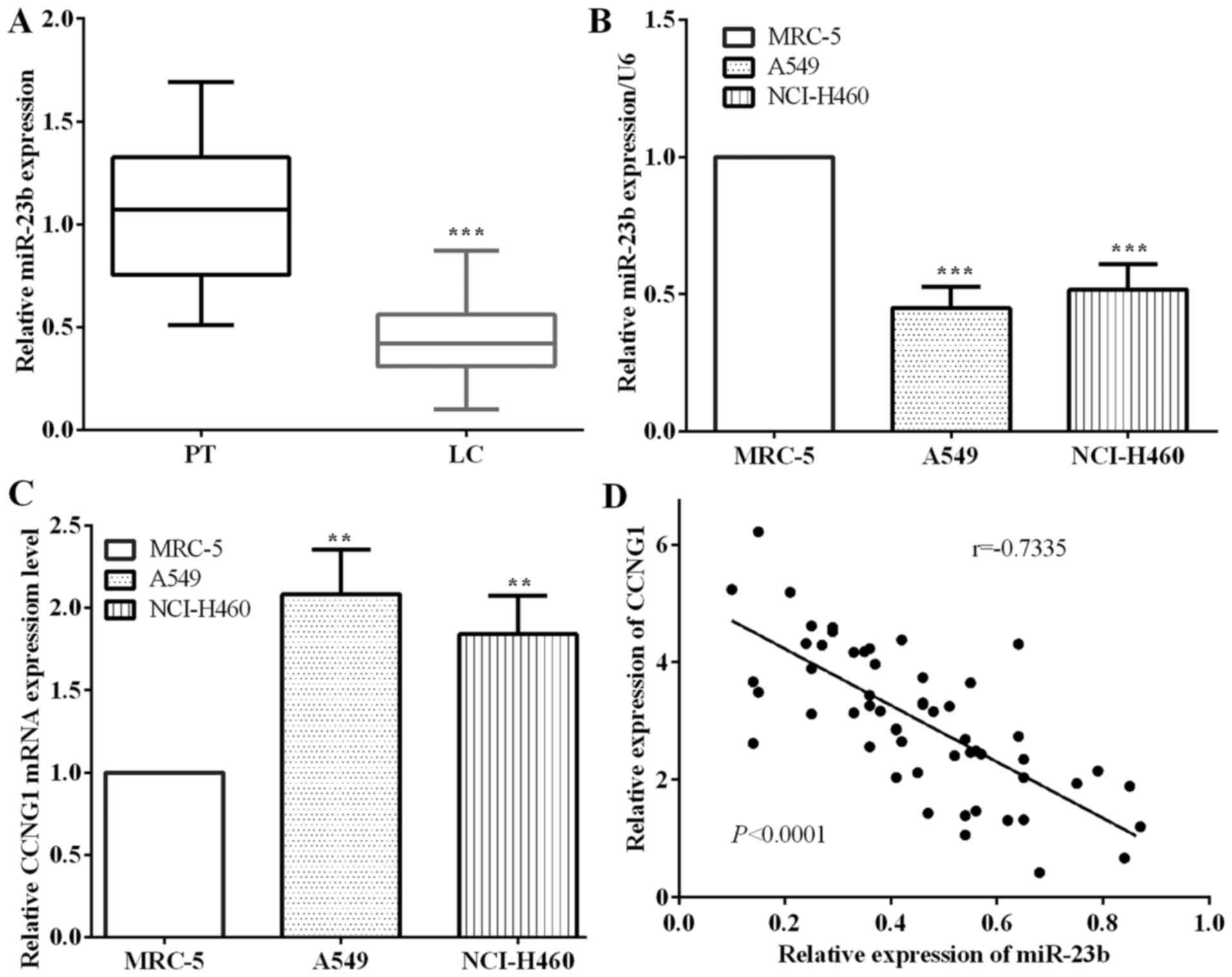 The expression of miR-23b and CCNG1 was examined by RT-qPCR in cancerous and paracancerous tissues of 57 cases with lung cancer. The results showed that the expression of miR-23b in paracancerous tissues was obviously higher than that in cancerous tissues (P<0.0001) (Fig. 1A). There was no significant difference observed between the four lung carcinoma subtypes. Moreover, we detected the expression of lung cancer A549 and NCI-H460 cells and normal lung MRC-5 cells, and found that the expression of miR-23b was significantly lower in A549 (P=0.0002) and NCI-H460 (P=0.0008) cells compared with MRC-5 cells, which are similar results with those of tissues samples (Fig. 1B).