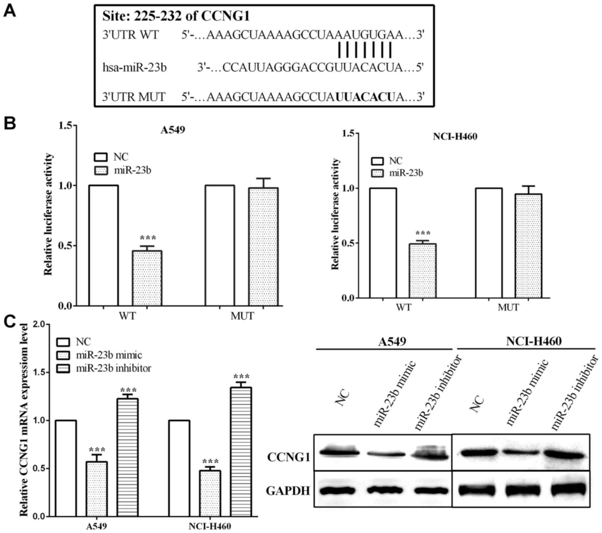miR-23b mimic or NC and pcDNA3.1-CCNG1-WT or MUT were co-transfected into lung cancer A549 and NCI-H460 cells to detect the luciferase reporter activity. Luciferase assay was detected using Dual-Luciferase® Reporter Assay System (Promega Corp., Madison, WI, USA) with Renilla luciferase as normalization. Each experiment was performed in triplicate.