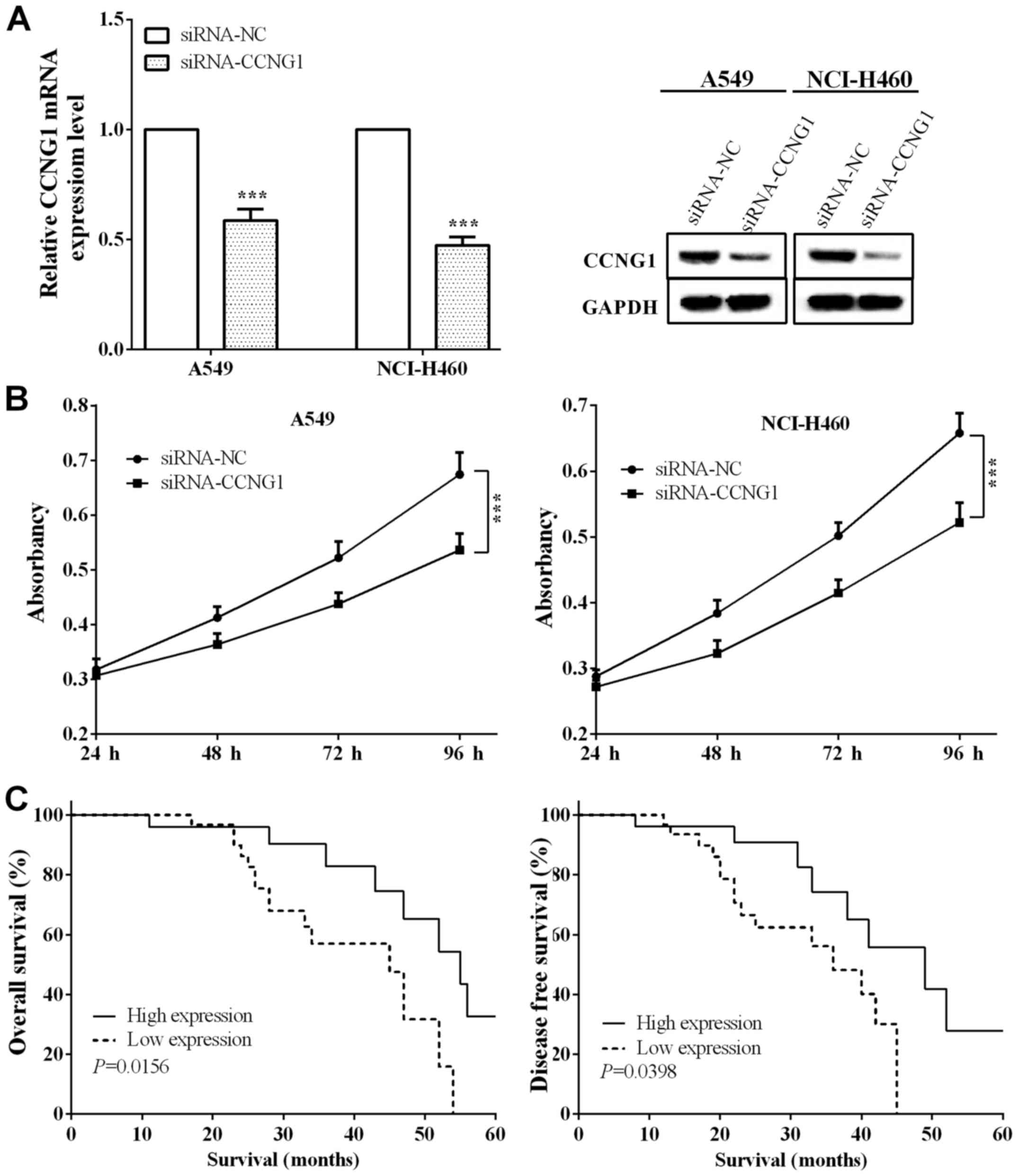 Total proteins were extracted from lung cancer cells using RIPA lysis buffer, supplemented with PMSF (both from Beijing Solarbio Science & Technology Co., Ltd., Beijing, China). After centrifuged for 20 min at 4°C with 12,000 × g speed, the concentration of protein was measured by BCA reagent kit (Beijing Solarbio Science & Technology Co., Ltd.). Following electrophoresis using 10% sodium dodecyl sulphate-polyacrylamide gel electrophoresis (SDS-PAGE), the separated proteins were transferred to the polyvinylidene fluoride membrane (PVDF; Millipore). The concentration of the concentrated gel was 5%, and the concentration of the separated gel was 10%. The membrane was incubated with mouse anti-CCNG1 monoclonal antibody (1:1,000; cat. no. WH0000900M1; Sigma-Aldrich; Merck KGaA) at 4°C overnight, with GAPDH mouse antibody (1:3,000; cat. no. TA802519, ZSGB-BIO; OriGene Technologies, Inc., Beijing, China) as internal control. A mouse secondary antibody (1:4,000, cat. no. sc-516142; Santa Cruz Biotechnology, Inc.) containing conjugated horseradish peroxidase was used to incubate the membrane for 1 h at room temperature. The proteins (CCNG1 and GAPDH) were evaluated by ECL western blotting detection system (BestBio, Shanghai, China).