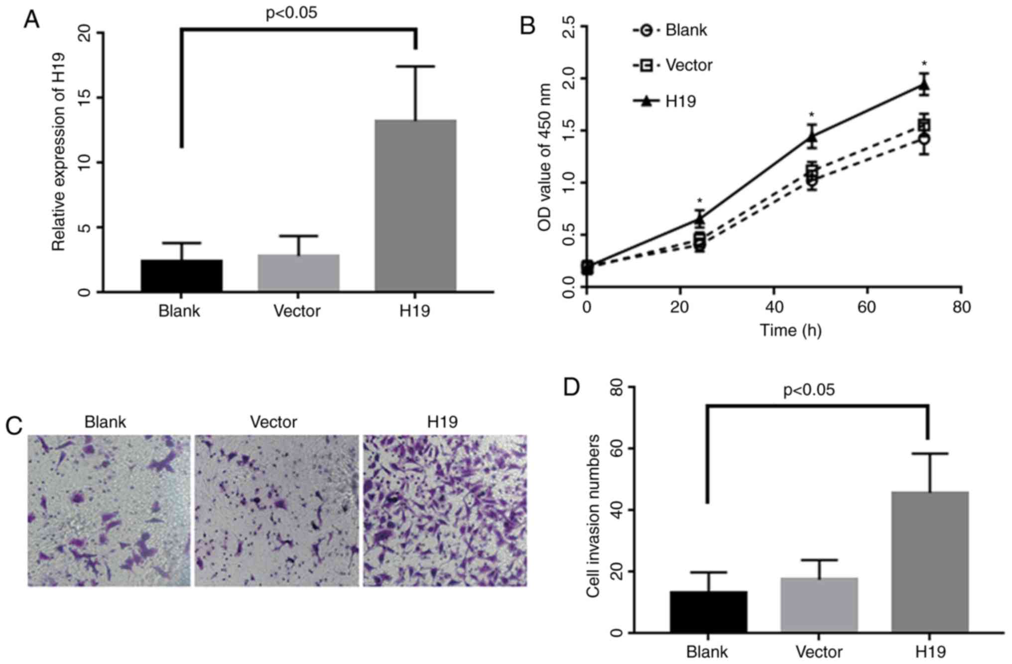 Based on the expression results, A549 cell line was chosen for another functional study. Cells were transfected with H19 plasmid and validated by quantitative real time polymerase chain reaction (qRT-PCR). The results showed that the expression level of H19 in transfected cells increased more than 20-fold than control cells (P<0.05; Fig. 2A). Cell proliferation results indicated that cell proliferation became significantly enhanced in H19 over expressed cells in contrast to the control group following 72 h incubation period (Fig. 2B). The invasion results demonstrated that the number of crossing members were significantly increased in H19 overexpression group when compared to negative control group (P<0.05; Fig. 2C and D).