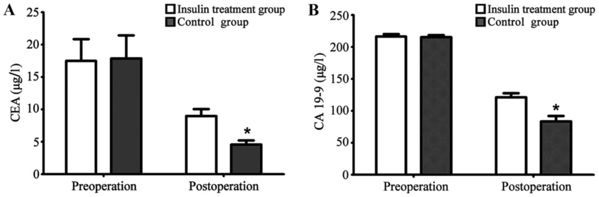 Levels of gastric markers, CEA and CA 19-9 in the treatment and non-treatment groups before and 3 months after operation were recorded and compared. Differences were not significant (P>0.05). Compared with the preoperative levels, levels of carcinoembryonic antigen in both groups were significantly decreased after operation (P<0.05), and decreases were more significant in insulin treatment group than in control group (P<0.05) (Fig. 2A). Compared with preoperative levels, levels of carcinoembryonic antigen in both groups were significantly decreased after operation (P<0.05), and decreases were more significant in the insulin treatment group than in the control group (P<0.05) (Fig. 2B and Table III).