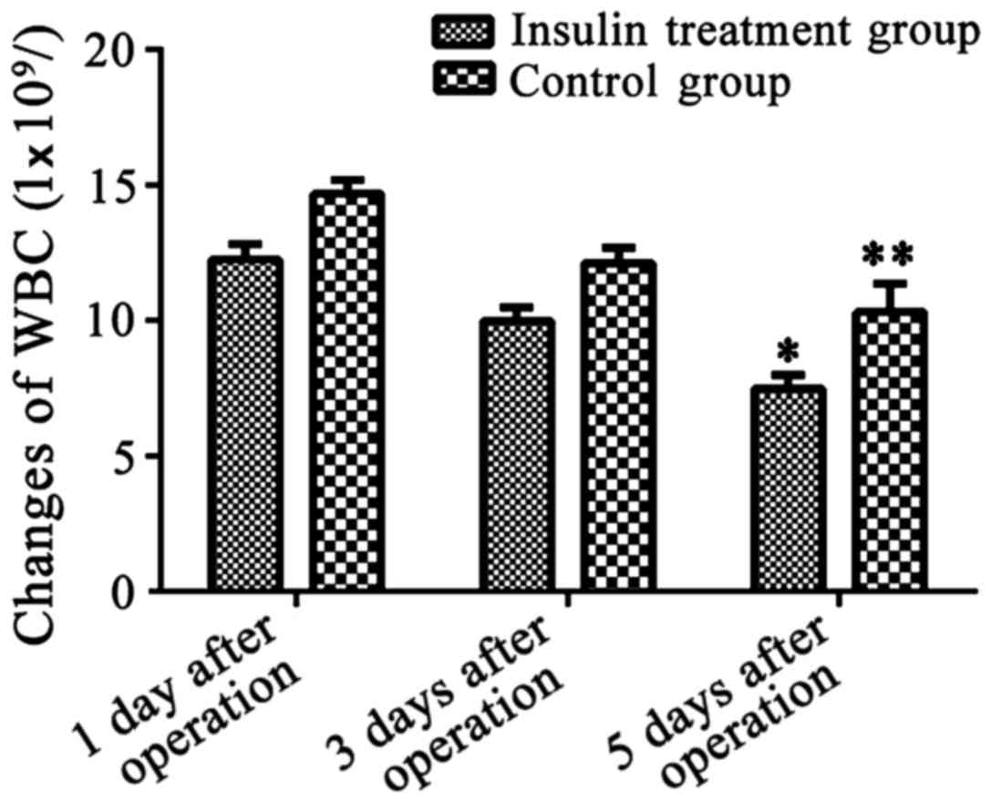 Changes in inflammatory response indexes, white blood cells and CRP in insulin treatment group and non-insulin treatment group on the 1st, 3rd and 5th day after operation were recorded. Results showed that levels of inflammatory response indexes in the two groups of patients on the 5th day after operation were significantly decreased compared with those on the 1st day after operation. Decreases in white blood cells were more significant in patients of the insulin treatment group than those in the control group (P<0.05, Fig. 3). Decreases in CRP were more significant in patients of the insulin treatment group than those in the control group. (P<0.05, Fig. 4)