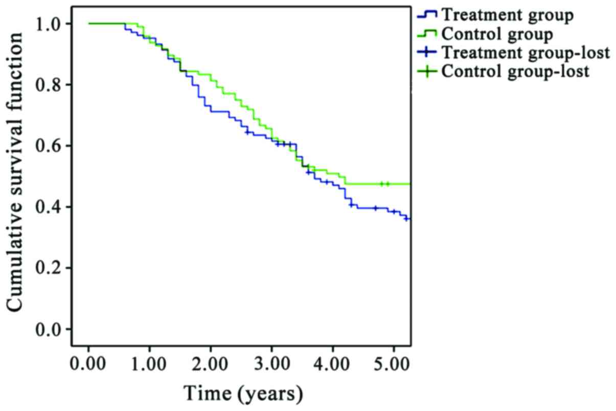 Statistical Product and Service Solutions (SPSS) 21.0 software was used for all statistical analyses. Kaplan-Meier method was used to calculate the 5-year survival rate. Measurement data were expressed as mean ± SD and the t-test was used for comparisons between two groups. The χ2 test was used for comparisons of count data. Pairwise t-test was used for comparisons of data at two time-points within a group, and analysis of variance followed by post hoc test (Least Significant Difference) was used for comparisons among multiple time points within a group. P<0.05 was considered to indicate a statistically significant difference.