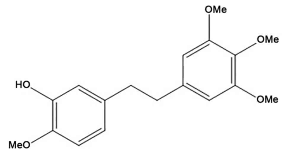 Erianin [2-Methoxy-5-(2-(3,4,5-trimethoxyphenyl)-ethyl)-phenol] (Fig. 1) is a natural bibenzyl compound present in Dendrobium chrysotoxum Lindl., which is commonly known as Shihu in China; it has been used as a herbal drug for thousands of years in traditional Chinese medicine (TCM), where it is often used as antipyretic and analgesic medication (5). Previous studies have demonstrated that erianin can elicit multiple pharmacological effects, including anti-oxidative (6) and antitumor activity (7). Erianin has been reported to inhibit cell proliferation and induce apoptosis in human promyelocytic leukemia HL-60 cells (8), and reverse multidrug resistance in B16/hMDR-1 cells (9). However, the effect of erianin on cervical cancer HeLa cells and the underlying molecular mechanisms behind these effects remain unclear. Thus, in the present study, the anticancer effects of erianin in HeLa cells compared with paclitaxel, a frequently used chemotherapeutic drug, were examined. Additionally, the involvement of tumor protein p53 and extracellular signal-regulated kinase (ERK) signaling were also investigated as potential molecular mechanism. The present study aimed to elucidate the effects and potential mechanism of erianin on cervical cancer HeLa cells in vitro.