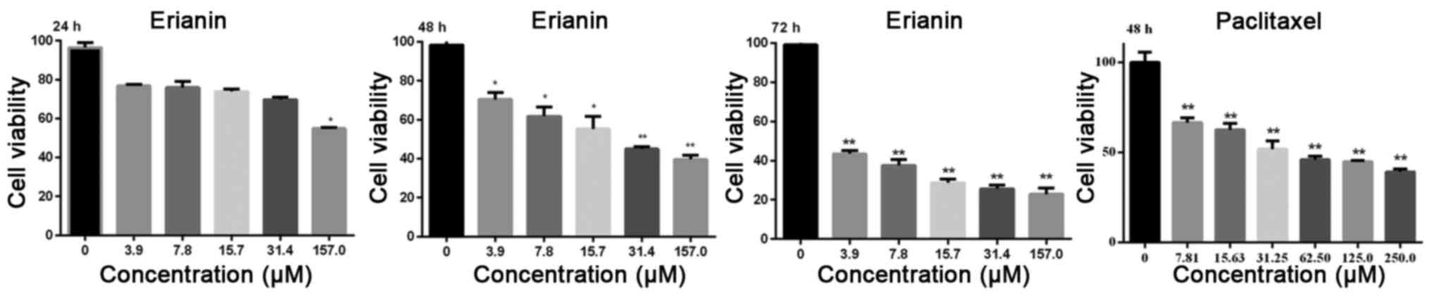 The cytotoxic activity of erianin on HeLa cells was assessed using an MTT assay. HeLa cells were treated with erianin at various concentrations (3.9, 7.8, 15.7, 31.4 or 157.0 µM) for different time points (24, 48 or 72 h), and then incubated with MTT (0.5 mg/ml) at 37°C for 4 h. Meanwhile, HeLa cells were treated with PTX (7.81, 15.63, 31.25, 62.50, 125.0 and 250.0 nM) for 48 h as the positive groups. The purple formazan crystals were dissolved in 0.15 ml of DMSO. Following shaking, the plates read on an automated microplate spectrophotometer at 570 nm. Assays were performed in triplicate in three independent experiments.